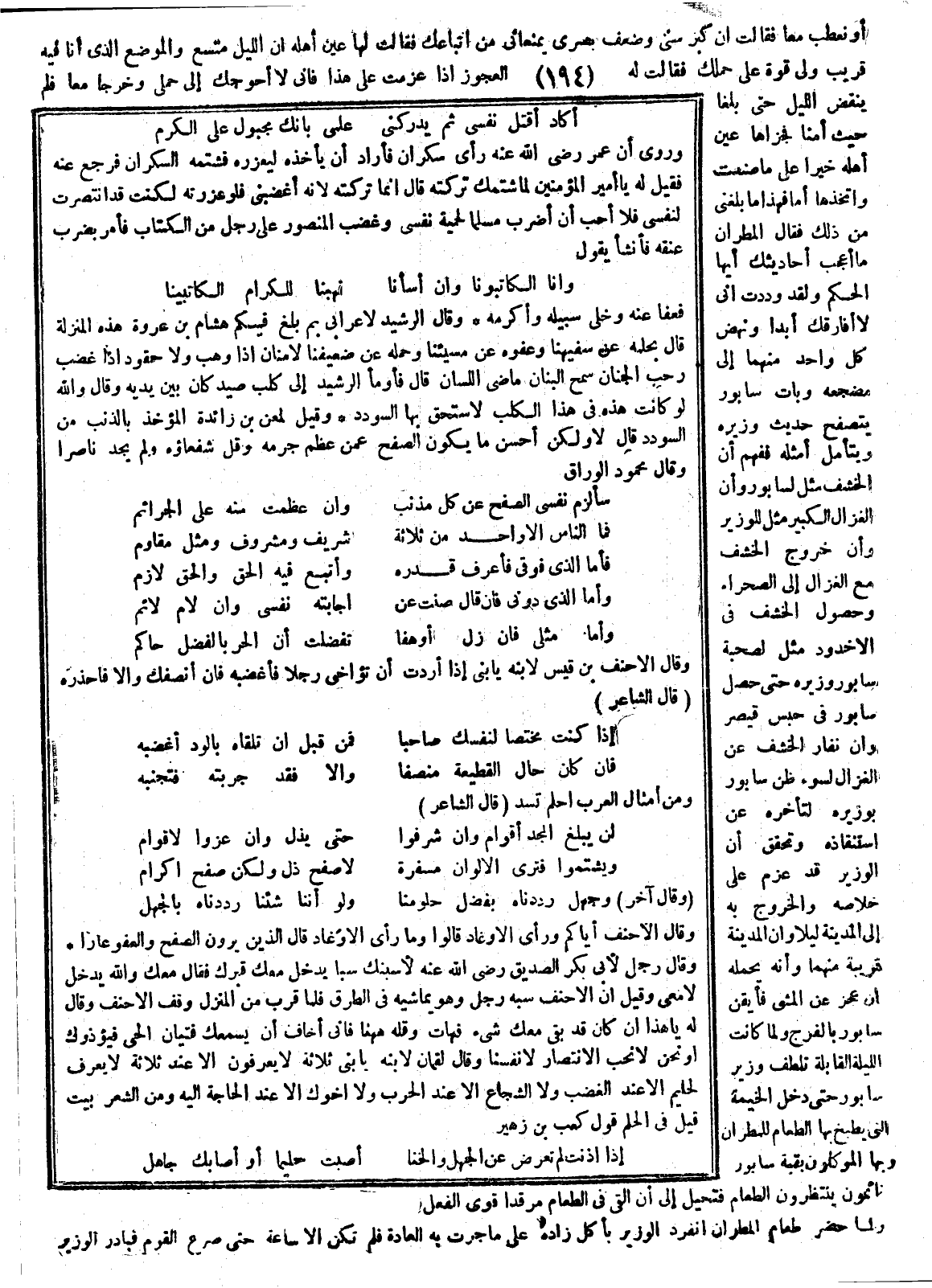 أو نعطب معا فقالت إن كبر سني وضعف بصري يمنعاني من اتباعك فقال لها عين أهله إن الليل متسع والموضع الذي أنا فيه قريب ولي قوة على حملك فقالت له العجوز إذا عزمت على هذا فإني لا أحوجك إلى حملي وخرجا معا فلم ينقض الليل حتى بلغا حيث أمنا فجزاها عين أهله خيرا على ما صنعت واتخذها أمّا، فهذا ما بلغني من ذلك فقال المطران ما أعجب أحاديثك أيها الحكيم ولقد وددت أني لا أفارقك أبدا ونهض كل واحد منهما إلى مضجعه وبات سابور يتصفح حديث وزيره ويتأمل أمثاله ففهم أن الخشف مثل سابور وأن الغزال الكبير مثل الوزير وأن خروج الخشف مع الغزال إلى الصحراء وحصول الخشف في الأخدود مثل لصحبة سابور بوزيره لتأخره عن استنقاذه وتحقق أن الوزير قد عزم على خلاصه والخروج به إلى المدينة ليلا وأن المدينة قريبة منهما وأنه يحمله إن عجز عن المشي فأيقن سابور بالفرج ولما كانت الليلة القابلة تلطف وزير سابور حتى دخل الخيمة التي يطبخ بها الطعام للمطران وبها الموكلون بقبة سابور نائمون ينتظرون الطعام فتحيل إلى أن ألقى في الطعام مرقدا قوي الفعل ولما حضر طعام المطران انفرد الوزير بأكل زاده على ما جرت به العادة فلم تكن إلا ساعة حتى صرع القوم فبادر الوزير