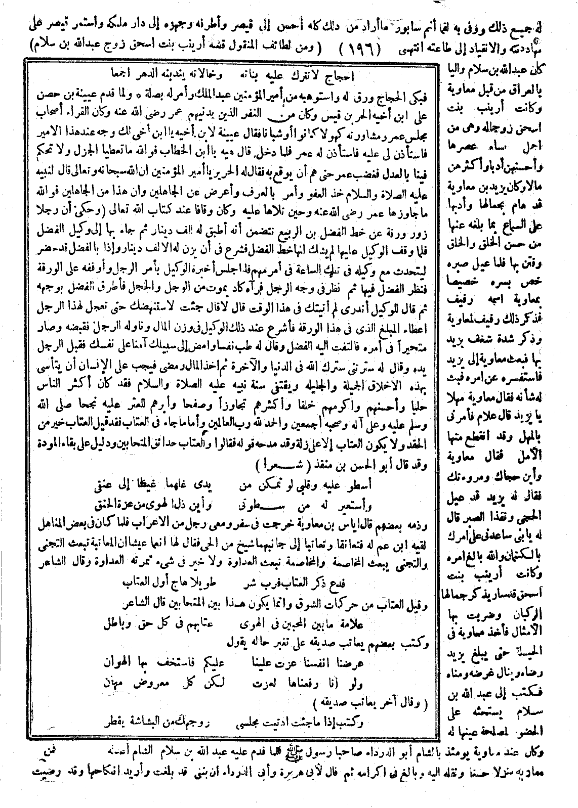 ومن لطائف المنقول قصة أرينب بنت اسحق زوج عبد الله بن سلام كان عبد الله بن سلام واليا بالعراق من قبل معاوية وكانت أرينب بنت اسحق زوجا له وهي من أجمل نساء عصرها وأحسنهن أدبا وأكثرهن مالا وكان يزيد ابن معاوية قد هام بجمالها وأدبها على السماع وبما بلغه عنها من حسن الخلق والخُلق وفتن بها فلما عيل صبره خص بسره خصيصا بمعاوية اسمه رفيف فذكر ذلك رفيف لمعاوية وذكر شدة شغف يزيد بها فبعث معاوية إلى يزيد فاستفسره عن أمره فبث له شأنه فقال معاوية: مهلا يا يزيد قال علام تأمرني بالمهل وقد انقطع منها الأمل فقال معاوية وأين حجاك ومروءتك فقال له يزيد قد عيل الحجى ونفد الصبر قال يا بني ساعدني على أمرك بالكتمان والله بالغ أمره وكانت أرينب بنت اسحق قد سارت بذكر جمالها الركبان وضربت بها الأمثال فأخذ معاوية في الحيلة حتى يبلغ يزيد رضاه وينال غرضه ومناه فكتب إلى عبد الله ابن سلام يستحثُّه على الحضور لمصلحة عينّها له وكان معاوية يومئذ بالشام أبو هريرة وأبو الدرداء صاحبا الرسول صلى الله عليه وسلم فلما قدم عليه عبد الله بن سلام الشام أعد له معاوية منزلا حسنا ونقله إليه وبالغ في إكرامه ثم قال لأبي هريرة وأبي الدرداء أن ابنتي قد بلغت وأريد انكاحها وقد رضيت