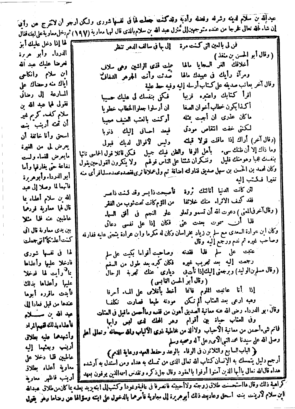 عبد الله بن سلام لدينه وشرفه وفضله وأدبه وقد كنت جعلت لها في نفسها شورى ولكن أرجو أن لا تخرج عن رأيي إن شاء الله تعالى فخرجا من عنده متوجهين إلى منزل عبد الله بن سلام بالذي قال لهما معاوية ثم دخل معاوية على ابنته فقال لها إذا دخل عليك ابو الدرداء وأبو هريرة فعرضا عليك عبد الله بن سلام وإنكاحي إياك منه وحضاك على المسارعة إلى رضائي فقولي لهما عبد الله بن سلام كفء كريم غير أن تحته أرينب بنت اسحق وأنا خائفة أن يعرض لي من الغيرة ما يعرض للنساء ولست بفاعلة حتى يفارقها وأما أبو الدرداء وأبو هريرة فإنهما لما وصلا إلى عبد الله بن سلام أعلماه بما قال لهما معاوية فردهما خاطبين عنه فلما مثلا بين يدي معاوية قال إني كنت أعلمتكما أنني جعلت لها في نفسها شورى فادخلا عليها واعلمها بما رأيت لها فدخلا وأعلماها بذلك فأبدت ما قرره أبوها عندها من قبل فعادا إلى عبد الله بن سلام فأعلماه بذلك ففهم المراد وأشهدهما عليه بطلاق أرينب وبعثهما إليه خاطبين فلما دخلا على معاوية أعلماه بطلاق أرينب فأظهر معاوية كراهية ذلك وقال ما استحسنت طلاق زوجته ولا أحببته فانصرفا في عافية وعودا غلينا وكتب إلى ابنه يزيد يعلمه بما كان من طلاق عبد علله بن سلام لأرينب بنت اسحق وعاد بعد ذلك أبو الدرداء وأبو هريرة إلى معاوية فأمرهما بالدخول على ابنته وسؤالها عن رضاها وهو يقول