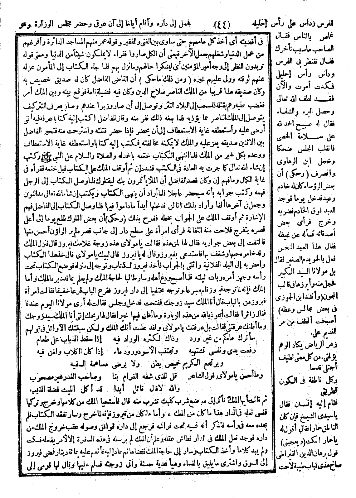 الفرس وداس على رأس أحليله فحمل إلى داره وأقام أياما إلى أن عوفي وحضر مجلس الوزارة وهو غاص بالناس فقال الصاحب ما سبب تأخرك فقال تقنطر بي الفرس وداس رأس احليلي فكدت أموت والآن فقد لطف الله تعالى وحصل البرء والشفاء فقال له صبيح: الحمد لله على سلامة الخصي فانقلب المجلس ضحكا وخجل ابن الرهاوي وانصرف. وحكي أن بعض الرؤساء كان له خادم وعبد فدخل يوما فوجد العبد فوق الخادم فضربه وخرج فرأى بعض أصدقائه فساله عن غيظه فقال هذا العبد النحس فعل بالخويدم الصغير فقال بل مولانا السيد الكبير فخجل منه وأبرزها في قالب المجون.