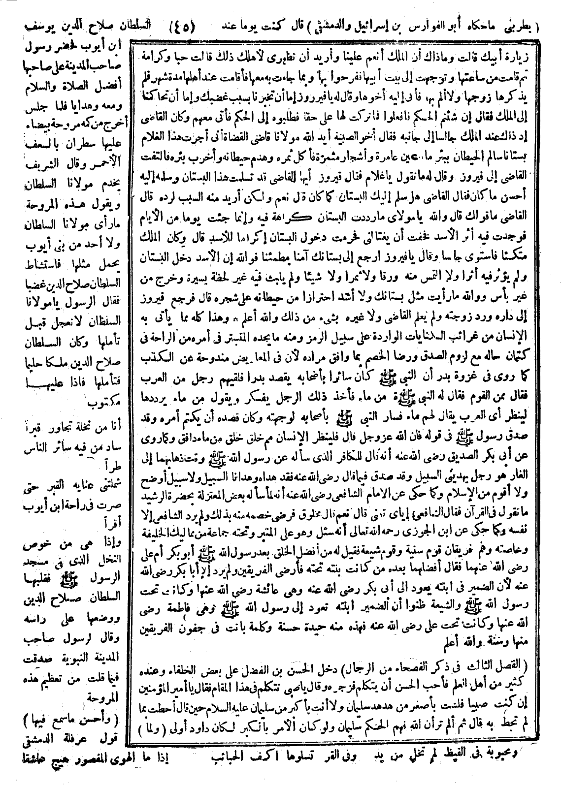ويطربني ما حكاه أبو الفوارس بن اسرائيل الدمشقي. قال كنت يوما عند السلطان صلاح الدين يوسف بن ايوب فحضر رسول صاحب المدينة على صاحبها أفضل الصلاة والسلام ومعه قواد وهدايا فلما جلس أخرج من كمه مروحة بيضاء عليها سطران بالسعف الأحمر وقال الشريف يخدم مولانا السلطان ويقول هذه المروحة ما رأى مولانا السلطان ولا أحد من بني أيوب مثلها فاستشاط السلطان صلاح الدين غضباً فقال الرسول يا مولانا السلطان لا تعجل قبل تأملها وكان السلطان صلاح الدين ملكا حليما فتأملها فإذا عليها مكتوب: