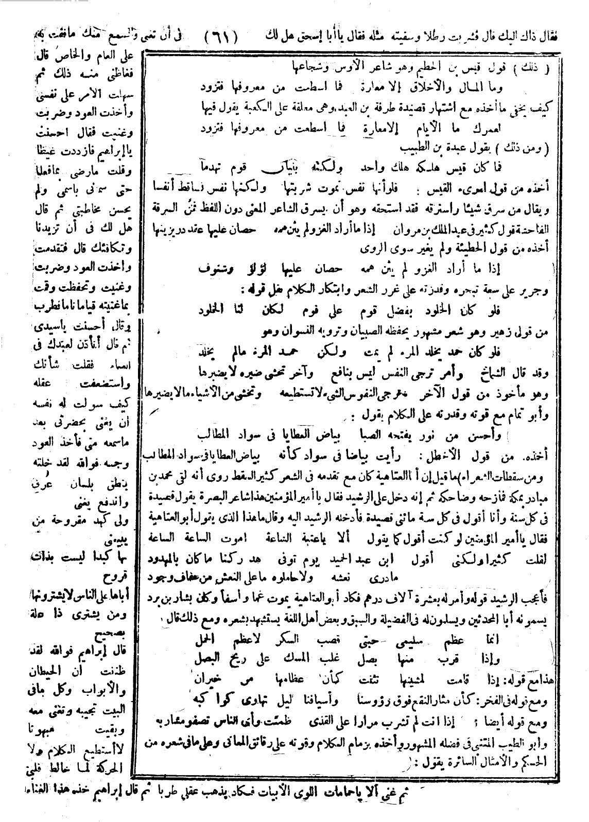 فقال ذاك إليك قال فشربت رطلا وسقيته مثله فقال يا أبا إسحق هل لك في أن تغني ونسمع منك ما فقت به على العام والخاص، قال فغاظني منه ذلك ثم سهلت الأمر على نفسي، أخذت العود وضربت وغنيت فقال: أحسنت يا إبراهيم فازددت غيظا وقلت ما رضي بما فعله حتى سماني باسمي ولم يحسن مخاطبتي، ثم قال: هل لك في أن تزيدنا ونكافئك قال فتقدمت وأخذت العود وضربت وغنيت وتحفظت وقمت بما غنيته قياما تاما فطرب وقال أحسنت يا سيدي ثم قال أتأذن لعبدك في الغناء