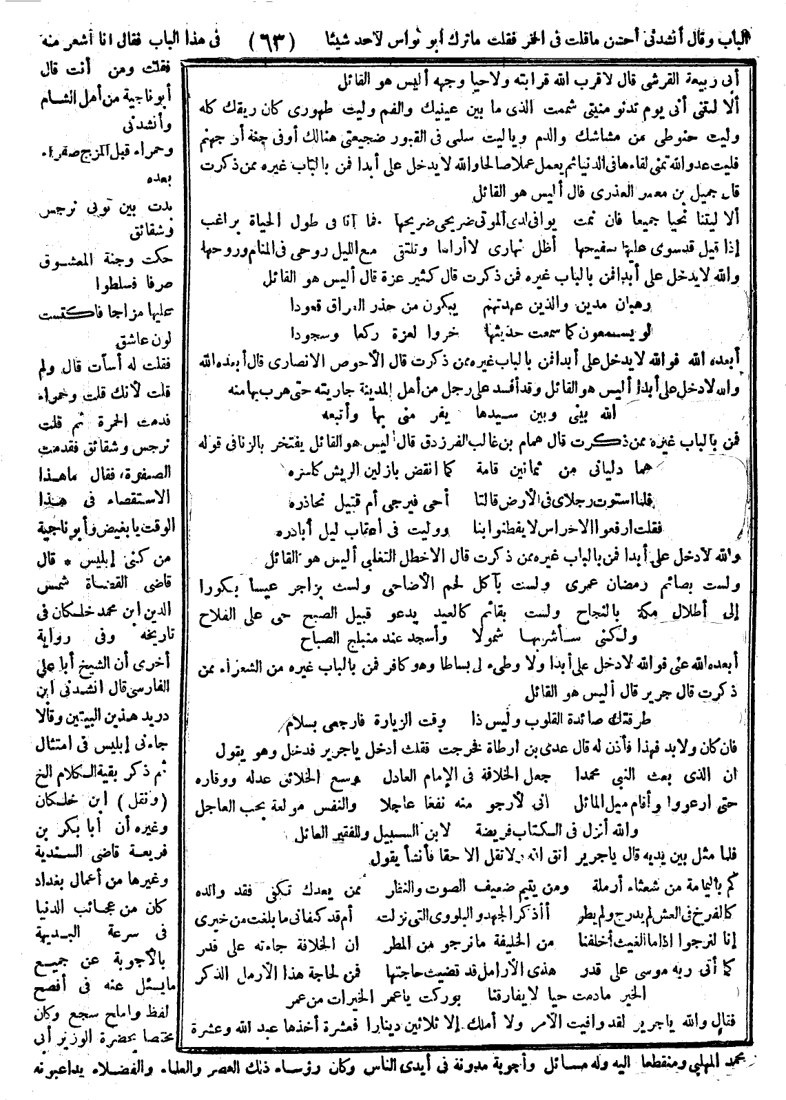 فقلت له أسأت قال ولم: قلت لأنك قلت حمراء قدمت الحمرة ثم قلت نرجس وشقائق فقدمت الصفرة فقال ما هذا الاستقصاء في هذا الوقت يا بغيض وأبو ناجية من كني إبليس. قال قاضي القضاة شمس الدين محمد بن خلكان في تاريخه وفي رواية أخرى أن الشيخ أبا علي الفارسي قال أنشدني ابن دريد هذين البيتين وقال جاءني إبليس في المنام ثم ذكر بقية الكلام ألخ. ونقل ابن خلكان وغيره أن أبا بكر فريعة قاضي السندية وغيرها من أعمال بغداد كان من عجائب الدنيا في سرعة البديهة بالأجوبة عن جميع ما يسال عنه في أفصح لفظ وأملح سجع وكان مختصا بحضرة الوزير أبي محمد المهلبي ومنقطعا إليه وله مسائل وأجوبة مدونة في أيدي الناس وكان رؤساء ذلك العصر والعلماء والفضلاء يداعبونه