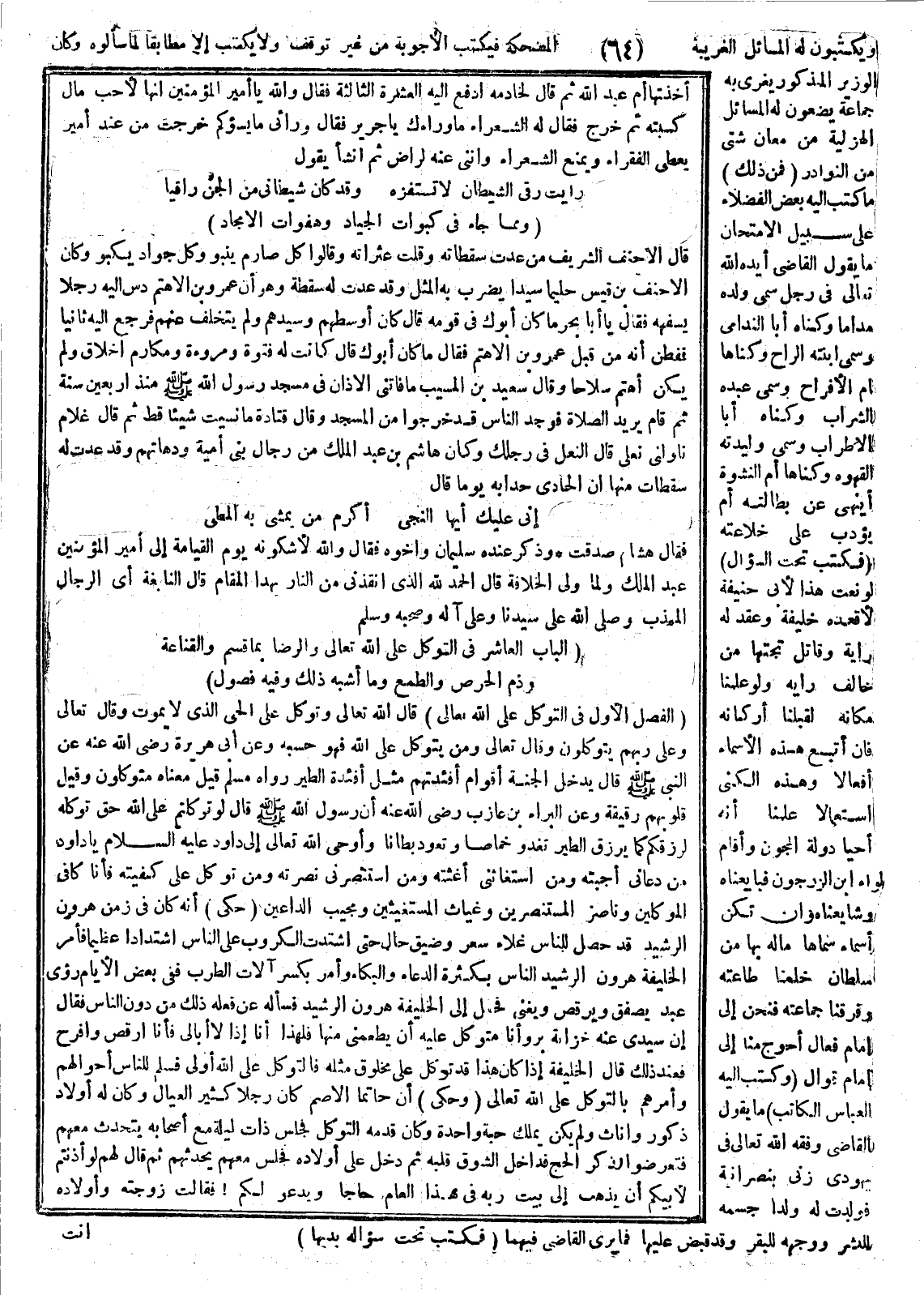 ويكتبون له المسائل الغريبة الغريبة المضحكة فيكتب الأجوبة من غير توقف ولا يكتب إلا مطابقاً لما سألوه وكان الوزير المذكور يغري به جماعة يصنعون له المسائل الهزلية من معان شتى من النوادر فمن ذلك ما كتب إليه بعض الفضلاء على سبيل الامتحان ما يقول القاضي أيده الله تعالى في رجل سمّى والده مداما وكناه أبا الندامى وسمى ابنته الراح وكناها أم الأفراح وسمى عبده الشراب وكناه أبا الإطراب وسمى وليدته القهوة وكناها أم النشوة أينهى عن بطالته أم يؤدب على خلاعته فكتب تحت السؤال لو نعت هذا لأبي حنيفة لأقعده خليفة وعقد له راية وقاتل تحتها من خالف رأيه ولو علمنا مكانه لقلبنا أركانه فإن أتبع هذه الأسماء أفعالا وهذه الكنى استعمالا علمنا أنه أحيا دولة المجون وأقام لواء ابن الزرجون فبايعناه وشايعناه وإن تكن أسماء سماها ما له بها من سلطان خلعنا طاعته وفرقنا جماعته فنحن إلى إمام فعال أحوج منا إلى إمام قوال وكتب إليه العباس الكاتب ما يقول القاضي وفقه الله تعالى في يهودي زنا بنصرانية فولدت له ولدا جسمه للبشر ووجهه للبقر وقد قبض عليهما فما يرى القاضي فيهما فكتب تحت سؤاله بديها
