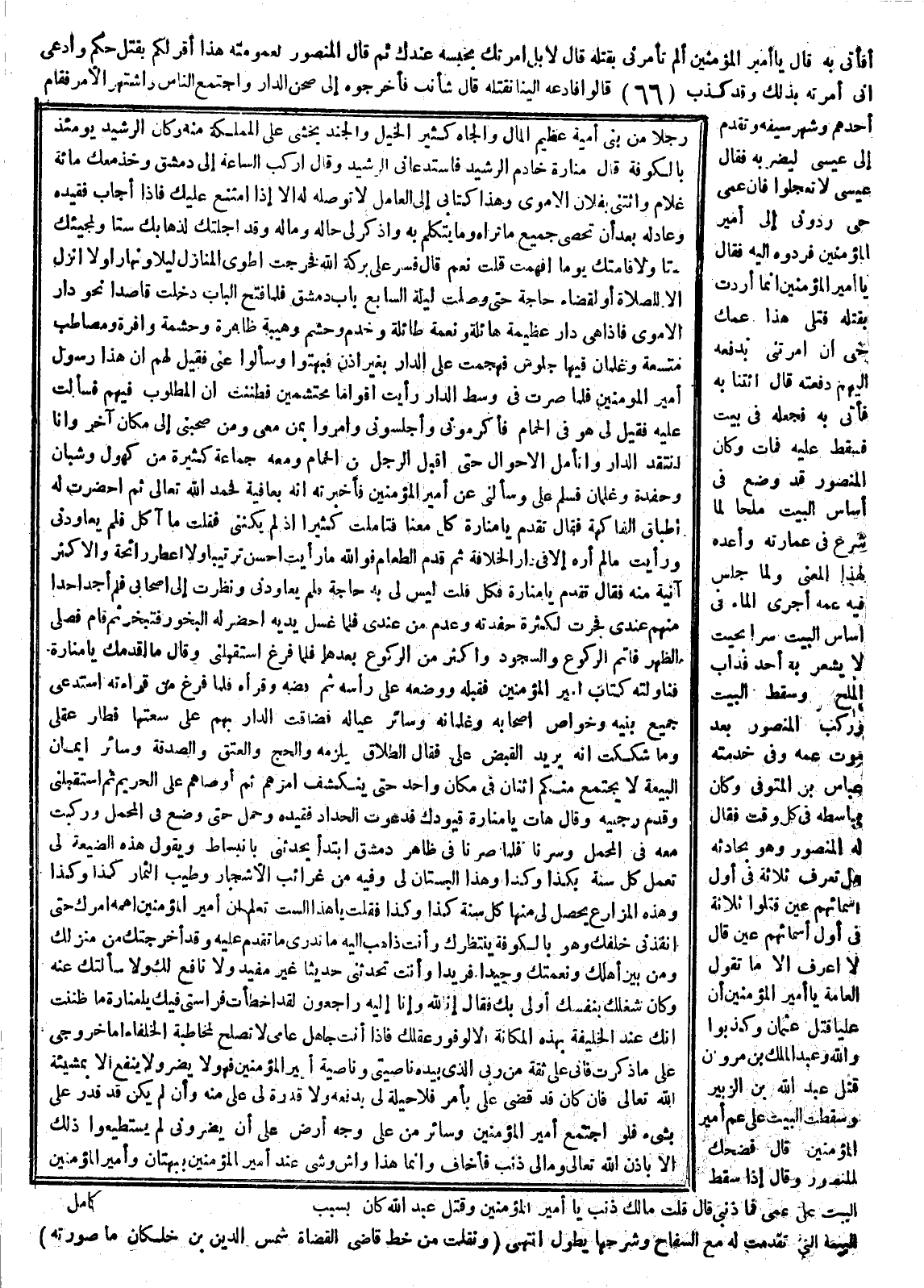 فأتني به قال يا أمير المؤمنين ألم تأمرني بقتله قال لا بل أمرتك بحبسه عندك ثم قال المنصور لعمومته إن هذا قد أقر لكم بقتل أخيكم وأدعى أني أمرته بذلك وقد كذب قالوا فدعه إليه نقتله قال شأنك فأخرجوه إلى صحن الدار واجتمع الناس واشتهر الأمر فقام أحدهم وشهر سيفه وتقدم إلى عيسى ليضربه فقال عيسى لا تعجلوا فإن عمي حي ردوني إلى أمير المؤمنين فردوه إليه فقال يا أمير المؤمنين إنما أردت بقتله قتلي هذا عمك حيا إن أمرتني بدفعه إليهم دفعته قال ائتنا به فأتى به فجعله في بيت فسقط عليه فمات وكان المنصور قد وضع في أساس البيت ملحاً لما شرع في عمارته وأعده لهذا المعنى ولما جلس فيه عمه أجرى الماء في أساس البيت سرا بحيث لا يشعر به أحد فذاب المليح وسقط البيت وركب المنصور بعد موت عمه وفي خدمته عباس ابن المتوفي وكان يباسطه في كل وقت فقال له المنصور وهو يحادثه هل تعرف ثلاثة في أول أسمائهم عين قال لا أعرف إلا ما تقول العامة يا أمير المؤمنين إن عليا قتل عثمان وكذبوا والله وعبد الملك بن مروان قتل عبد الله بن الزبير وسقط البيت على عم أمير المؤمنين قال فضحك المنصور وقال إذا سقط البيت على عمي فما ذنبي قال قلت ما لك ذنب يا أمير المؤمنين وقتل عبد الله كان بسبب البيعة التي تقدمت له مع السفاح وشرحها يطول انتهى.