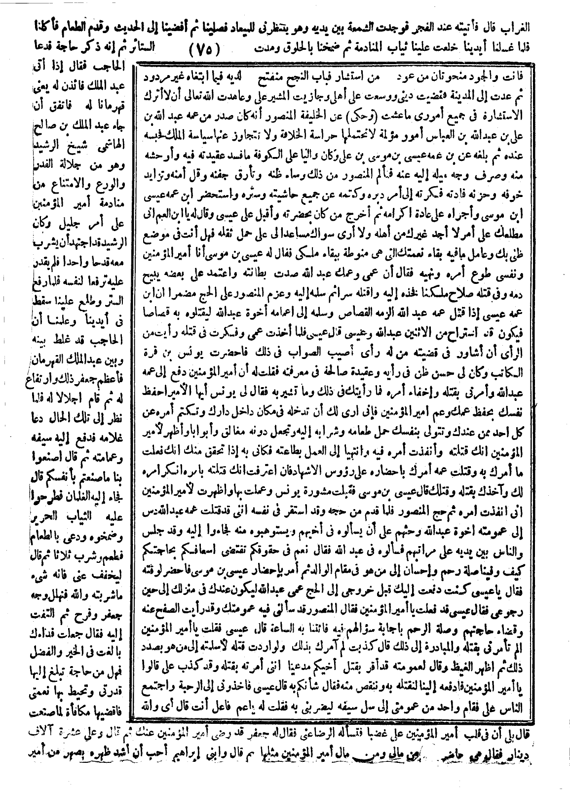الغراب قال فأتيته عند الفجر فوجدت الشمعة بين يديه وهو ينتظرني للميعاد فصلينا ثم أفضينا إلى الحديث وقدم الطعام فأكلنا فلما غسلنا أيدينا خلعت علينا ثياب المنامة ثم ضمخنا بالخلوق ومدت الستائر ثم إنه ذكر حاجة فدعا الحاجب فقال إذا أتى عبد الملك فأذن له يعني قهرماناً له فاتفق أن جاء عبد الملك بن صالح الهاشمي شيخ الرشيد وهو من جلالة القدر والورع والامتناع من منادمة أمير المؤمنين على أمر جليل وكان الرشيد قد اجتهد أن يشرب معه قدحا واحدا فلم يقدر عليه ترفعا لنفسه فلما رفع الستر وطلع علينا سقط في أيدينا وعلمنا أن الحاجب قد غلط بينه وبين عبد الملك القهرمان فأعظم جعفر ذلك وارتاع له ثم قام اجلالا له فلما نظر إلى تلك الحال دعا غلامه فدفع إليه سيفه وعمامته ثم قال اصنعوا بنا ما صنعتم بأنفسكم قال فجاء إليه الغلمان فطرحوا عليه الثياب الحرير وضمخوه ودعي بالطعام فطعم وشرب ثلاثا ثم قال ليخفف عني فإنه شيء ما شربته والله فتهلل وجه جعفر وفرح ثم التفت إليه فقال جعلت فداءك بالغت في الخير والفضل فهل من حاجة تبلغ إليها قدرتي وتحيط بها نعمتي فأقضيها مكافأة لم صنعت قال بلى إن في قلب أمير المؤمنين علي غضبا فتسأله الرضا عني فقال له جعفر قد رضي أمير المؤمنين عنك ثم قال وعلي عشرة آلاف دينار فقال هي لك حاضرة من مالي ومن مال أمير المؤمنين مثلها ثم قال وابني إبراهيم أحب أن أشد ظهره بصهر من أمير