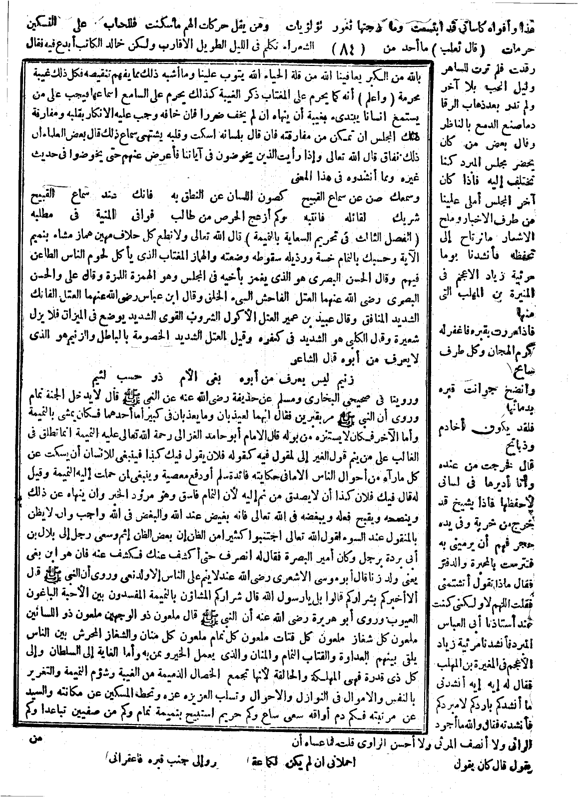 قال فخرجت من عنده وأنا أديرها في لساني لأحفظها فإذا بشيخ قد خرج من خربة وفي يده حجر فهم أن يرميني به فتترست بالمحبرة والدفتر فقال ماذا تقول أتشتمني فقلت اللهم لا ولكني كنت عند أستاذنا أبي العباس المبرد فأنشدنا مرثية زياد الأعجم في المغيرة بن المهلب فقال له إيه إيه أنشدني ما أنشدكم باردكم لا مبردكم فأنشدته فقال والله ما أجاد الراثي ولا أنصف المرثي ولا أحسن الراوي قلت فما عساه أن يقول قال كان يقول: