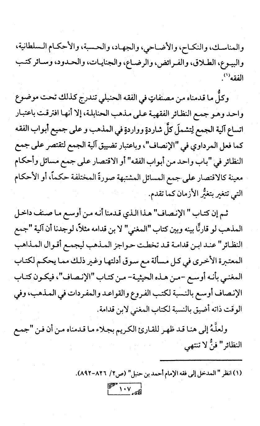 ثم إن كتاب " الإنصاف" هذا الذي قدمنا أنه من أوسع ما صنف داخل المذهب لو قارنَّا بينه وبين كتاب "المغني" لا بن قدامه مثلاً، لوجدنا أن آلية "جمع النظائر" عند ابن قدامة قد تخطت حواجز المذهب ليجمع أقوال المذاهب المعتبرة الأخرى في كل مسألة مع سوق أدلتها وغير ذلك مما يحكم لكتاب المغني بأنه أوسع -من هذه الحيثية- من كتاب "الإنصاف"، فيكون كتاب الإنصاف أوسع بالنسبة لكتب الفروع والقواعد والمفردات في المذهب، وفي الوقت ذاته أضيق بالنسبة لكتاب المغني لابن قدامة.