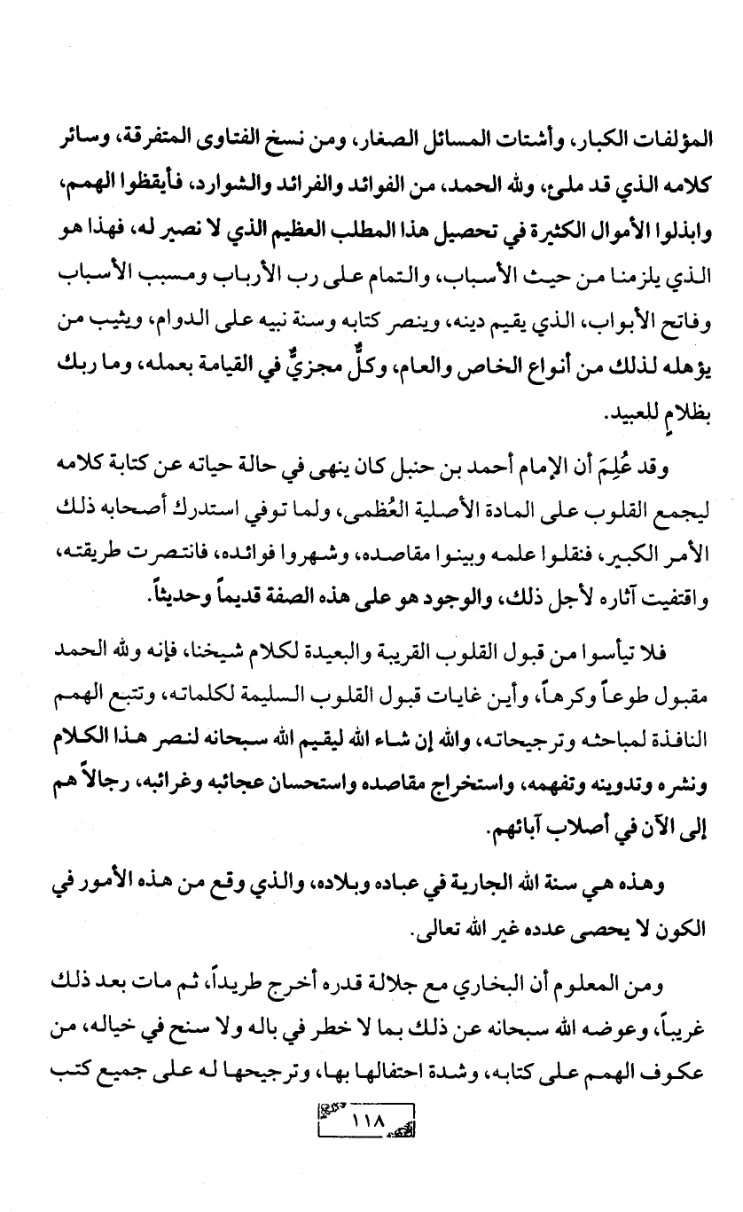 المؤلفات الكبار، وأشتات المسائل الصغار، ومن نسخ الفتاوى المتفرقة، وسائر كلامه الذي قد ملئ، ولله الحمد، من الفوائد والفرائد والشوارد، فأيقظوا الهمم، وابذلوا الأموال الكثيرة في تحصيل هذا المطلب العظيم الذي لا نصير له، فهذا هو الذي يلزمنا من حيث الأسباب، والتمام على رب الأرباب ومسبب الأسباب وفاتح الأبواب، الذي يقيم دينه، وينصر كتابه وسنة نبيه على الدوام، ويثيب من يؤهله لذلك من أنواع الخاص والعام، وكلٌّ مجزيٌّ في القيامة بعمله، وما ربك بظلامٍ للعبيد.
