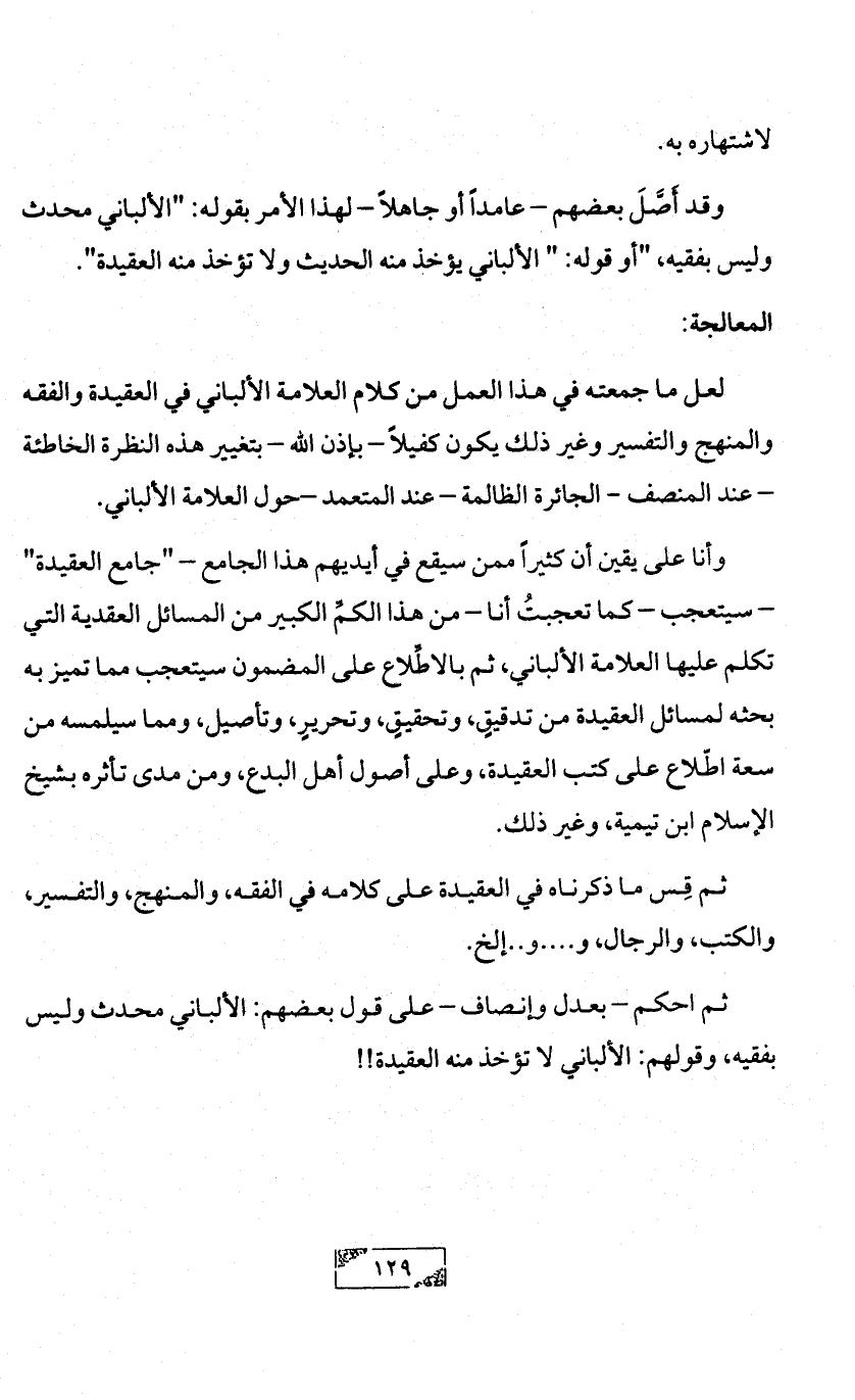 لعل ما جمعته في هذا العمل من كلام العلامة الألباني في العقيدة والفقه والمنهج والتفسير وغير ذلك يكون كفيلاً - بإذن الله - بتغيير هذه النظرة الخاطئة - عند المنصف - الجائرة الظالمة - عند المتعمد -حول العلامة الألباني.