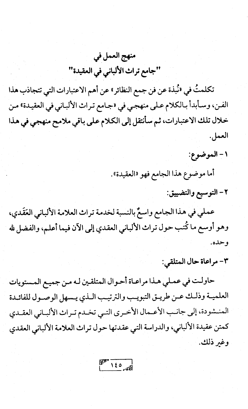 حاولت في عملي هذا مراعاة أحوال المتلقين له من جميع المستويات العلمية وذلك عن طريق التبويب والترتيب الذي يسهل الوصول للفائدة المنشودة، إلى جانب الأعمال الأخرى التي تخدم تراث الألباني العقدي كمتن عقيدة الألباني، والدراسة التي عقدتها حول تراث العلامة الألباني العقدي وغير ذلك.