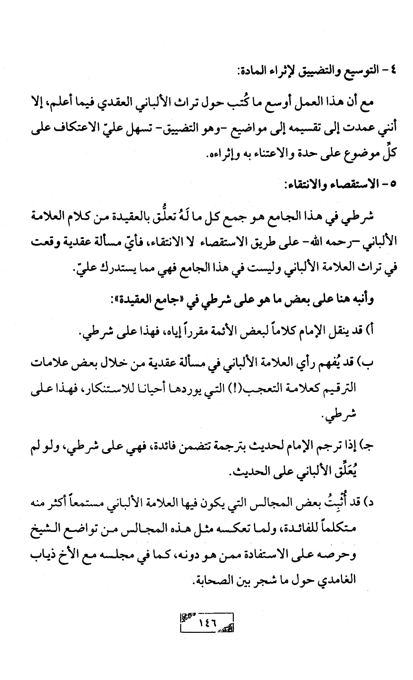 شرطي في هذا الجامع هو جمع كل ما لَهُ تعلُّق بالعقيدة من كلام العلامة الألباني -رحمه الله- على طريق الاستقصاء لا الانتقاء، فأيّ مسألة عقدية وقعت في تراث العلامة الألباني وليست في هذا الجامع فهي مما يستدرك عليّ.