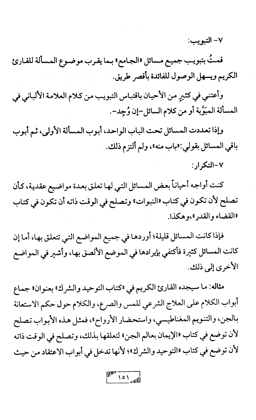 وأعتني في كثيرٍ من الأحيان باقتباس التبويب من كلام العلامة الألباني في المسألة المبَوَّبة أو من كلام السائل-إن وُجِد-.