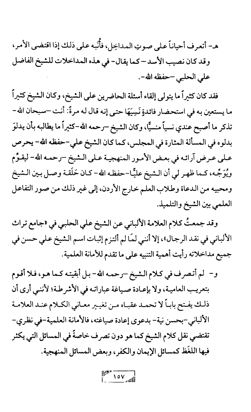 هـ- أتعرف أحياناً على صوتِ المداخِل، فأُنَبه على ذلك إذا اقتضى الأمر، وقد كان نصيب الأسد - كما يقال- في هذه المداخلات للشيخ الفاضل علي الحلبي -حفظه الله-.