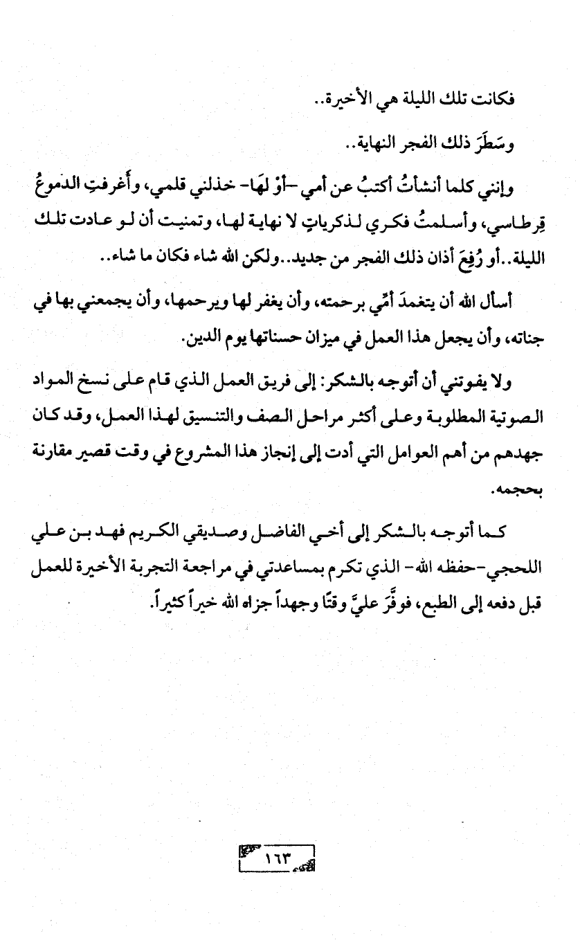 وإنني كلما أنشأتُ أكتبُ عن أمي -أوْ لَها- خذلني قلمي، وأَغرفتِ الدموعُ قِرطاسي، وأسلمتُ فكري لذكرياتٍ لا نهاية لها، وتمنيت أن لو عادت تلك الليلة .. أو رُفِعَ أذان ذلك الفجر من جديد .. ولكن الله شاء فكان ما شاء ..