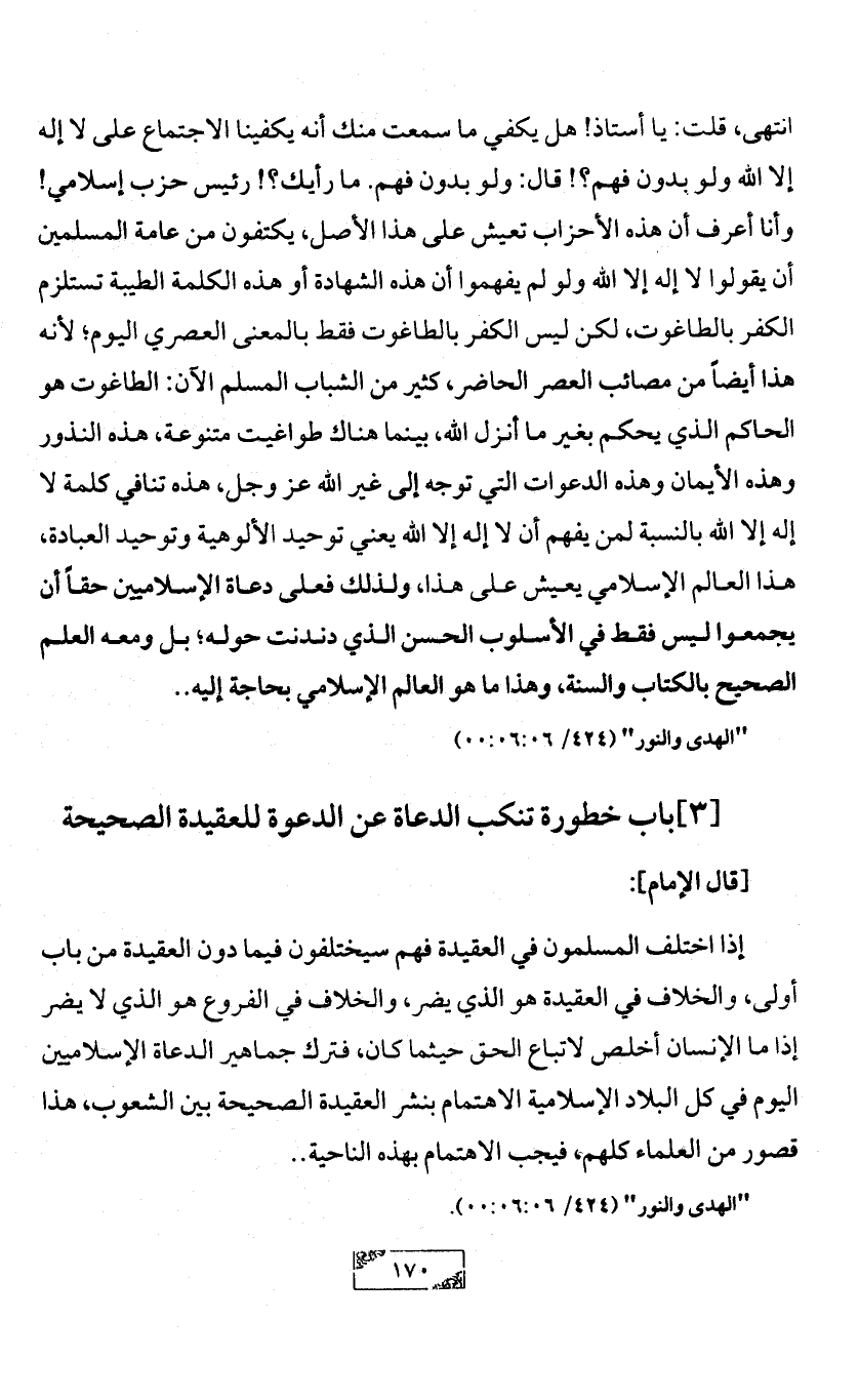 إذا اختلف المسلمون في العقيدة فهم سيختلفون فيما دون العقيدة من باب أولى، والخلاف في العقيدة هو الذي يضر، والخلاف في الفروع هو الذي لا يضر إذا ما الإنسان أخلص لاتباع الحق حيثما كان، فترك جماهير الدعاة الإسلاميين اليوم في كل البلاد الإسلامية الاهتمام بنشر العقيدة الصحيحة بين الشعوب، هذا قصور من العلماء كلهم، فيجب الاهتمام بهذه الناحية .. "الهدى والنور" (424/ 00:06:06).