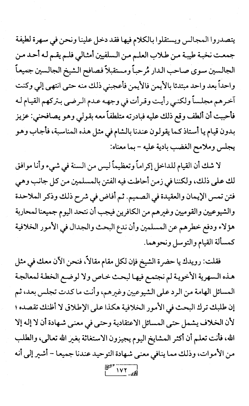 فقلت: رويدك يا حضرة الشيخ فإن لكل مقام مقالاً، فنحن الآن معك في مثل هذه السهرية الأخوية لم نجتمع فيها لبحث خاص ولا لوضع الخطة لمعالجة المسائل الهامة من الرد على الشيوعيين وغيرهم، وأنت ما كدت تجلس بعد، ثم إن طلبك ترك البحث في الأمور الخلافية هكذا على الإطلاق لا أظنك تقصده؛ لأن الخلاف يشمل حتى المسائل الاعتقادية وحتى في معنى شهادة أن لا إله إلا الله، فأنت تعلم أن أكثر المشايخ اليوم يجيزون الاستغاثة بغير الله تعالى، والطلب من الأموات، وذلك مما ينافي معنى شهادة التوحيد عندنا جميعا - أشير إلى أنه