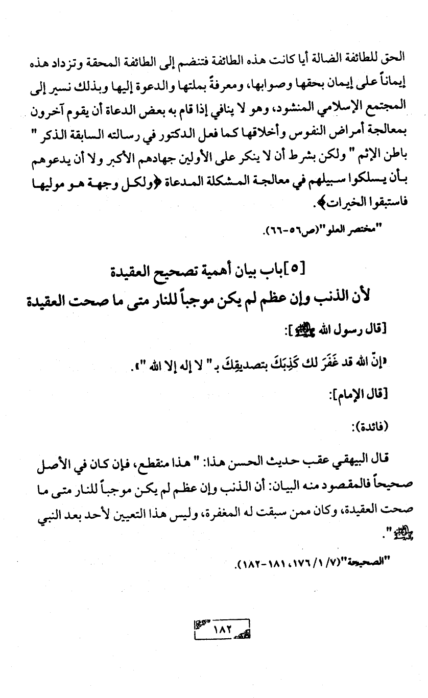 الحق للطائفة الضالة أيا كانت هذه الطائفة فتنضم إلى الطائفة المحقة وتزداد هذه إيماناً على إيمان بحقها وصوابها، ومعرفةً بملتها والدعوة إليها وبذلك نسير إلى المجتمع الإسلامي المنشود، وهو لا ينافي إذا قام به بعض الدعاة أن يقوم آخرون بمعالجة أمراض النفوس وأخلاقها كما فعل الدكتور في رسالته السابقة الذكر " باطن الإثم " ولكن بشرط أن لا ينكر على الأولين جهادهم الأكبر ولا أن يدعوهم بأن يسلكوا سبيلهم في معالجة المشكلة المدعاة {ولكل وجهة هو موليها فاستبقوا الخيرات}.