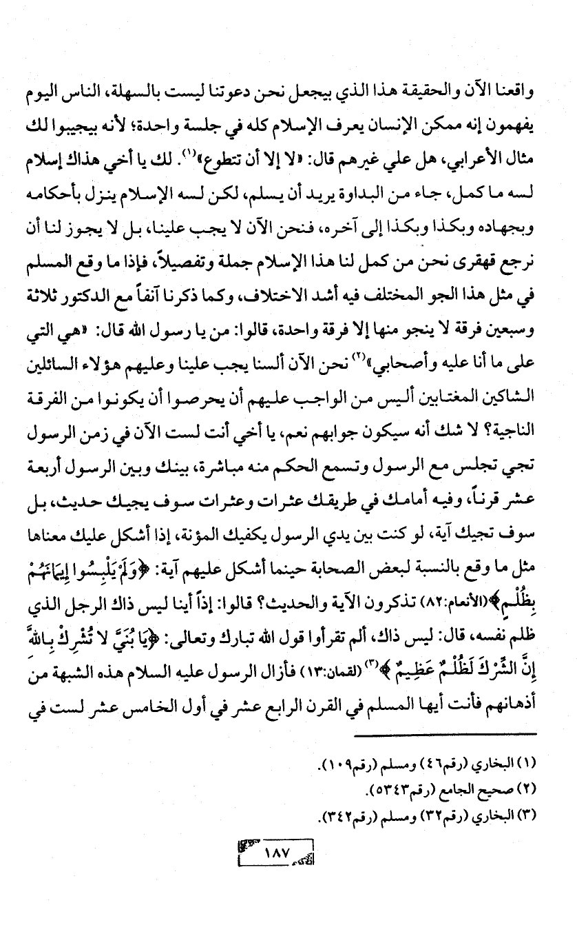 واقعنا الآن والحقيقة هذا الذي بيجعل نحن دعوتنا ليست بالسهلة، الناس اليوم يفهمون إنه ممكن الإنسان يعرف الإسلام كله في جلسة واحدة؛ لأنه بيجيبوا لك مثال الأعرابي، هل علي غيرهم قال: «لا إلا أن تتطوع» (¬1). لك يا أخي هذاك إسلام لسه ما كمل، جاء من البداوة يريد أن يسلم، لكن لسه الإسلام ينزل بأحكامه وبجهاده وبكذا وبكذا إلى آخره، فنحن الآن لا يجب علينا، بل لا يجوز لنا أن نرجع قهقرى نحن من كمل لنا هذا الإسلام جملة وتفصيلاً، فإذا ما وقع المسلم في مثل هذا الجو المختلف فيه أشد الاختلاف، وكما ذكرنا آنفاً مع الدكتور ثلاثة وسبعين فرقة لا ينجو منها إلا فرقة واحدة، قالوا: من يا رسول الله قال: «هي التي على ما أنا عليه وأصحابي» (¬2) نحن الآن ألسنا يجب علينا وعليهم هؤلاء السائلين الشاكين المغتابين أليس من الواجب عليهم أن يحرصوا أن يكونوا من الفرقة الناجية؟ لا شك أنه سيكون جوابهم نعم، يا أخي أنت لست الآن في زمن الرسول تجي تجلس مع الرسول وتسمع الحكم منه مباشرة، بينك وبين الرسول أربعة عشر قرناً، وفيه أمامك في طريقك عثرات وعثرات سوف يجيك حديث، بل سوف تجيك آية، لو كنت بين يدي الرسول يكفيك المؤنة، إذا أشكل عليك معناها مثل ما وقع بالنسبة لبعض الصحابة حينما أشكل عليهم آية: {وَلَمْ يَلْبِسُوا إِيمَانَهُمْ بِظُلْمٍ} (الأنعام:82) تذكرون الآية والحديث؟ قالوا: إذاً أينا ليس ذاك الرجل الذي ظلم نفسه، قال: ليس ذاك، ألم تقرأوا قول الله تبارك وتعالى: {يَا بُنَيَّ لا تُشْرِكْ بِاللَّهِ إِنَّ الشِّرْكَ لَظُلْمٌ عَظِيمٌ} (¬3) (لقمان:13) فأزال الرسول عليه السلام هذه الشبهة من أذهانهم فأنت أيها المسلم في القرن الرابع عشر في أول الخامس عشر لست في
