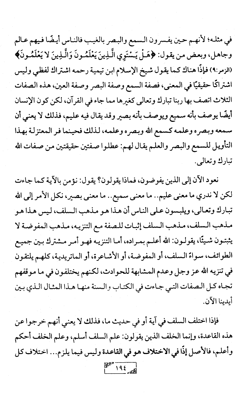 نعود الآن إلى الذين يفوضون، فماذا يقولون؟ يقول: نؤمن بالآية كما جاءت لكن لا ندري ما معنى عليم .. ما معنى سميع .. ما معنى بصير، نكل الأمر إلى الله تبارك وتعالى، ويلبسون على الناس أن هذا هو مذهب السلف، ليس هذا هو مذهب السلف، مذهب السلف إثبات للصفة مع التنزيه، مذهب المفوضة لا يثبتون شيئًا، يقولون: الله أعلم بمراده، أما التنزيه فهو أمر مشترك بين جميع الطوائف، سواءً السلف، أو المفوضة، أو الأشاعرة، أو الماتريدية، كلهم يلتقون في تنزيه الله عز وجل وعدم المشابهة للحوادث، لكنهم يختلفون في ما موقفهم تجاه كل الصفات التي جاءت في الكتاب والسنة منها هذا المثال الذي بين