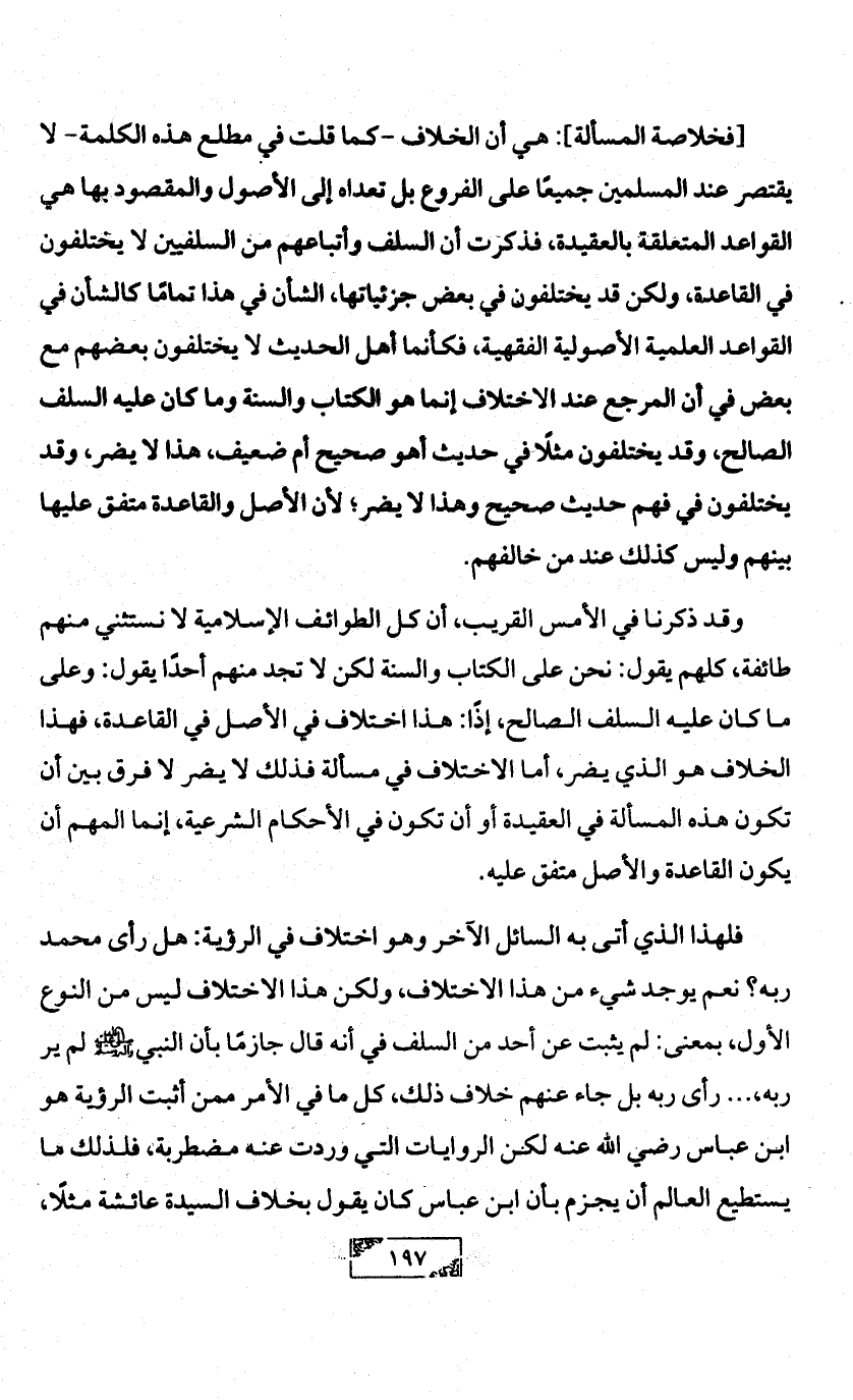 [فخلاصة المسألة]: هي أن الخلاف -كما قلت في مطلع هذه الكلمة- لا يقتصر عند المسلمين جميعًا على الفروع بل تعداه إلى الأصول والمقصود بها هي القواعد المتعلقة بالعقيدة، فذكرت أن السلف وأتباعهم من السلفيين لا يختلفون في القاعدة، ولكن قد يختلفون في بعض جزئياتها، الشأن في هذا تمامًا كالشأن في القواعد العلمية الأصولية الفقهية، فكأنما أهل الحديث لا يختلفون بعضهم مع بعض في أن المرجع عند الاختلاف إنما هو الكتاب والسنة وما كان عليه السلف الصالح، وقد يختلفون مثلًا في حديث أهو صحيح أم ضعيف، هذا لا يضر، وقد يختلفون في فهم حديث صحيح وهذا لا يضر؛ لأن الأصل والقاعدة متفق عليها بينهم وليس كذلك عند من خالفهم.