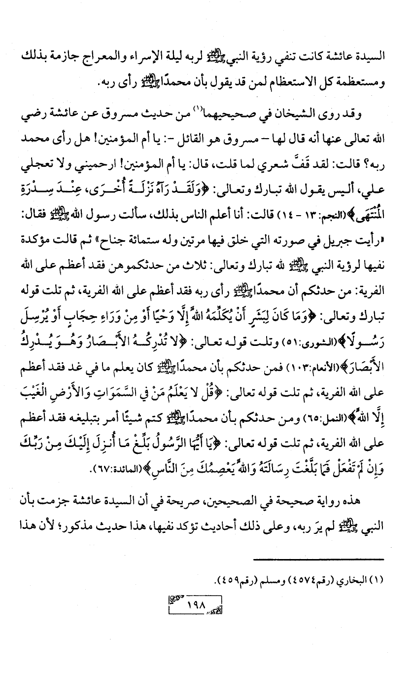 وقد روى الشيخان في صحيحيهما (¬1) من حديث مسروق عن عائشة رضي الله تعالى عنها أنه قال لها - مسروق هو القائل -: يا أم المؤمنين! هل رأى محمد ربه؟ قالت: لقد قَفَّ شعري لما قلت، قال: يا أم المؤمنين! ارحميني ولا تعجلي علي، أليس يقول الله تبارك وتعالى: {وَلَقَدْ رَآهُ نَزْلَةً أُخْرَى، عِنْدَ سِدْرَةِ الْمُنْتَهَى} (النجم: 13 - 14) قالت: أنا أعلم الناس بذلك، سألت رسول الله - صلى الله عليه وآله وسلم - فقال: «رأيت جبريل في صورته التي خلق فيها مرتين وله ستمائة جناح» ثم قالت مؤكدة نفيها لرؤية النبي - صلى الله عليه وآله وسلم - لله تبارك وتعالى: ثلاث من حدثكموهن فقد أعظم على الله الفرية: من حدثكم أن محمدًا - صلى الله عليه وآله وسلم - رأى ربه فقد أعظم على الله الفرية، ثم تلت قوله تبارك وتعالى: {وَمَا كَانَ لِبَشَرٍ أَنْ يُكَلِّمَهُ اللَّهُ إِلَّا وَحْيًا أَوْ مِنْ وَرَاءِ حِجَابٍ أَوْ يُرْسِلَ رَسُولًا} (الشورى:51) وتلت قوله تعالى: {لا تُدْرِكُهُ الأَبْصَارُ وَهُوَ يُدْرِكُ الأَبْصَارَ} (الأنعام:103) فمن حدثكم بأن محمدًا - صلى الله عليه وآله وسلم - كان يعلم ما في غد فقد أعظم على الله الفرية، ثم تلت قوله تعالى: {قُلْ لا يَعْلَمُ مَنْ في السَّمَوَاتِ وَالأَرْضِ الْغَيْبَ إِلَّا اللَّهُ} (النمل:65) ومن حدثكم بأن محمدًا - صلى الله عليه وآله وسلم - كتم شيئًا أمر بتبليغه فقد أعظم على الله الفرية، ثم تلت قوله تعالى: {يَا أَيُّهَا الرَّسُولُ بَلِّغْ مَا أُنزِلَ إِلَيْكَ مِنْ رَبِّكَ وَإِنْ لَمْ تَفْعَلْ فَمَا بَلَّغْتَ رِسَالَتَهُ وَاللَّهُ يَعْصِمُكَ مِنَ النَّاسِ} (المائدة:67).