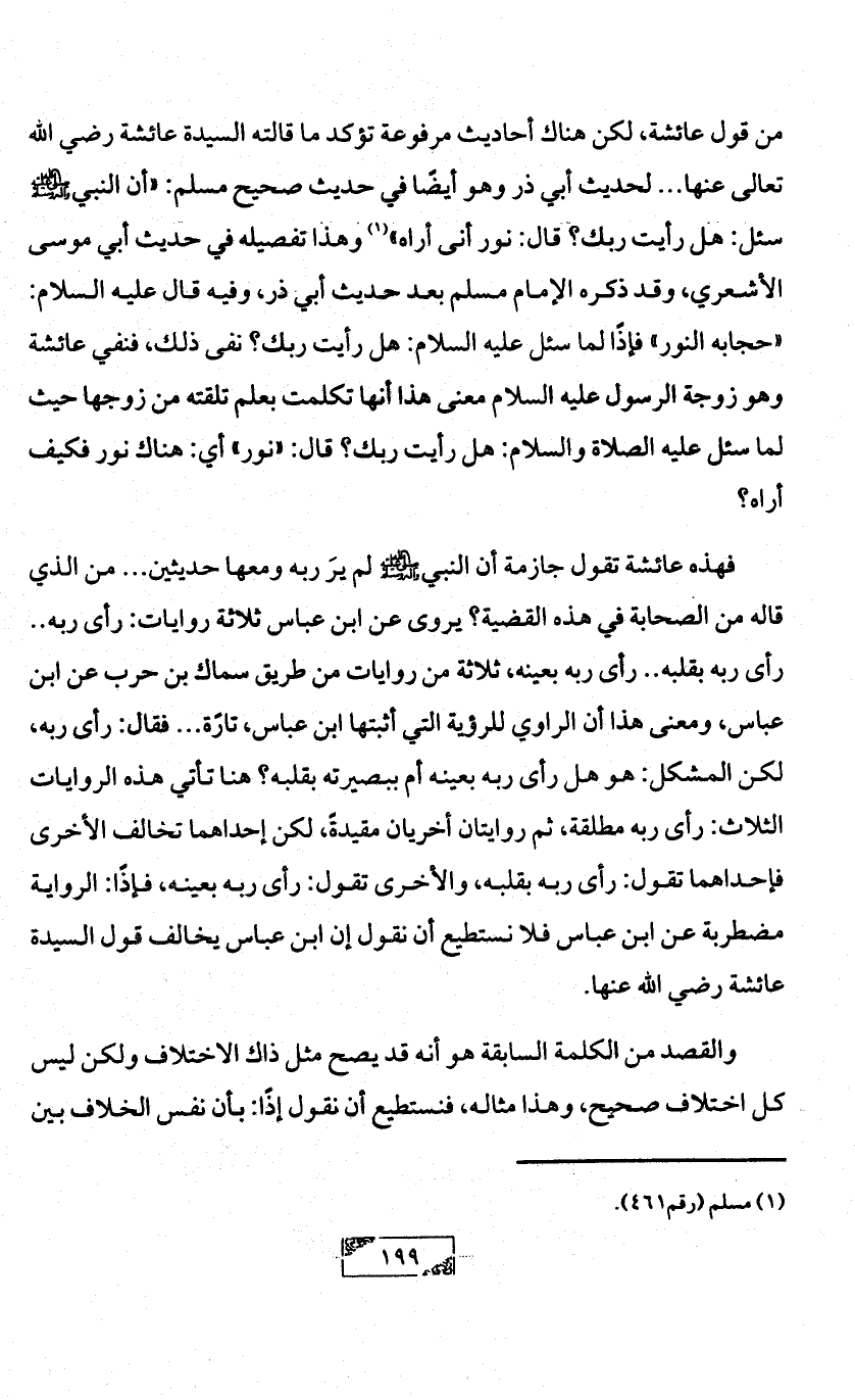 من قول عائشة، لكن هناك أحاديث مرفوعة تؤكد ما قالته السيدة عائشة رضي الله تعالى عنها ... لحديث أبي ذر وهو أيضًا في حديث صحيح مسلم: «أن النبي - صلى الله عليه وآله وسلم - سئل: هل رأيت ربك؟ قال: نور أنى أراه» (¬1) وهذا تفصيله في حديث أبي موسى الأشعري، وقد ذكره الإمام مسلم بعد حديث أبي ذر، وفيه قال عليه السلام: «حجابه النور» فإذًا لما سئل عليه السلام: هل رأيت ربك؟ نفى ذلك، فنفي عائشة وهو زوجة الرسول عليه السلام معنى هذا أنها تكلمت بعلم تلقته من زوجها حيث لما سئل عليه الصلاة والسلام: هل رأيت ربك؟ قال: «نور» أي: هناك نور فكيف أراه؟