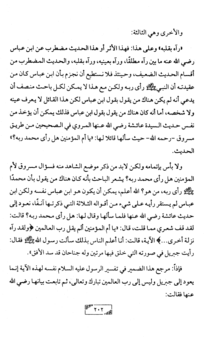 «رآه بقلبه» وعلى هذا: فهذا الأثر أو هذا الحديث مضطرب عن ابن عباس رضي الله عنه ما بين رآه مطلقًا، ورآه بعينيه، ورآه بقلبه، والحديث المضطرب من أقسام الحديث الضعيف، وحينئذ فلا نستطيع أن نجزم بأن ابن عباس كان من عقيدته أن النبي - صلى الله عليه وآله وسلم - رأى ربه ولكن مع هذا لا يمكن لكل باحث منصف أن يدعي أنه لم يكن هناك من يقول بقول ابن عباس لكن هذا القائل لا يعرف عينه ولا شخصه, أما أنه كان هناك من يقول بقول ابن عباس فذلك يمكن أن يؤخذ من نفس حديث السيدة عائشة رضي الله عنها المروي في الصحيحين من طريق مسروق -رحمه الله- حيث سألها قائلا لها: «يا أم المؤمنين هل رأى محمد ربه؟» الحديث.