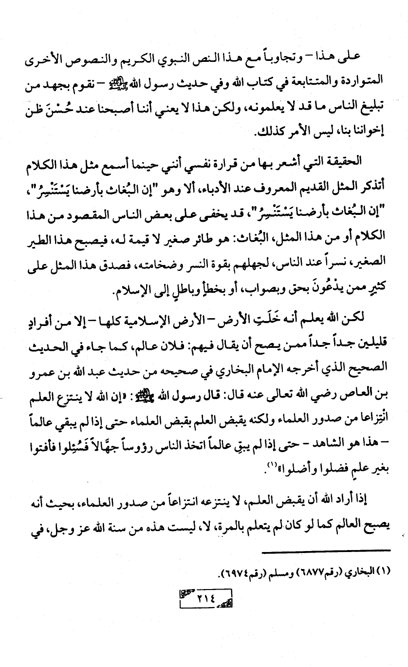 لكن الله يعلم أنه خَلَتِ الأرض - الأرض الإسلامية كلها - إلا من أفرادٍ قليلين جداً جداً ممن يصح أن يقال فيهم: فلان عالم، كما جاء في الحديث الصحيح الذي أخرجه الإمام البخاري في صحيحه من حديث عبد الله بن عمرو بن العاص رضي الله تعالى عنه قال: قال رسول الله - صلى الله عليه وآله وسلم -: «إن الله لا ينتزع العلم انْتِزاعا من صدور العلماء ولكنه يقبض العلم بقبض العلماء حتى إذا لم يبقي عالماً - هذا هو الشاهد - حتى إذا لم يبقِ عالماً اتخذ الناس رؤوساً جهَّالاً فَسُئِلوا فأفتوا بغير علمٍ فضلوا وأضلوا» (¬1).