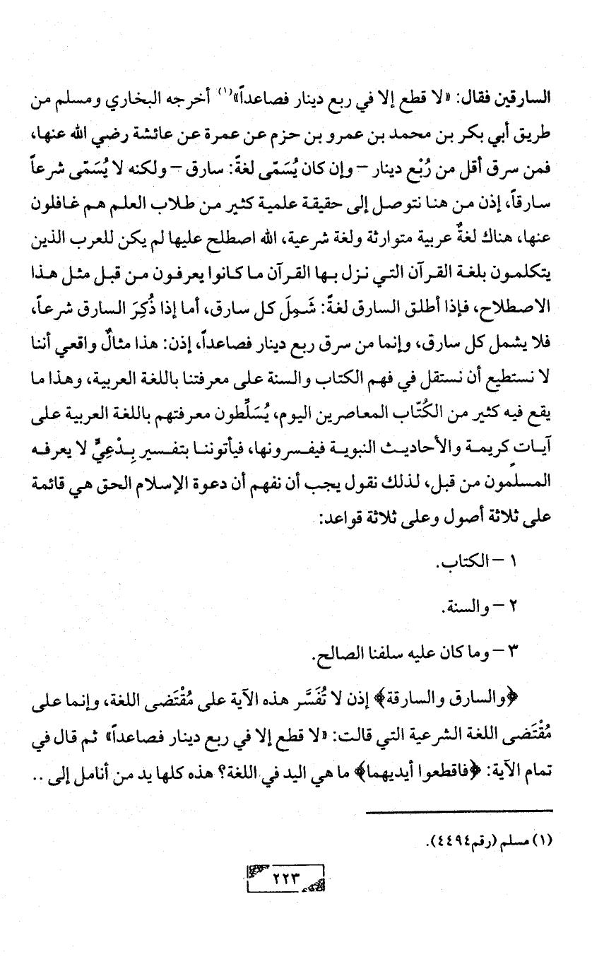 السارقين فقال: «لا قطع إلا في ربع دينار فصاعداً» (¬1) أخرجه البخاري ومسلم من طريق أبي بكر بن محمد بن عمرو بن حزم عن عمرة عن عائشة رضي الله عنها، فمن سرق أقل من رُبْع دينار - وإن كان يُسَمّى لغةً: سارق - ولكنه لا يُسَمّى شرعاً سارقاً، إذن من هنا نتوصل إلى حقيقة علمية كثير من طلاب العلم هم غافلون عنها، هناك لغةٌ عربية متوارثة ولغة شرعية، الله اصطلح عليها لم يكن للعرب الذين يتكلمون بلغة القرآن التي نزل بها القرآن ما كانوا يعرفون من قبل مثل هذا الاصطلاح، فإذا أطلق السارق لغةً: شَمِلَ كل سارق، أما إذا ذُكِرَ السارق شرعاً، فلا يشمل كل سارق، وإنما من سرق ربع دينار فصاعداً، إذن: هذا مثالٌ واقعي أننا لا نستطيع أن نستقل في فهم الكتاب والسنة على معرفتنا باللغة العربية، وهذا ما يقع فيه كثير من الكُتّاب المعاصرين اليوم، يُسَلِّطون معرفتهم باللغة العربية على آيات ٍكريمة والأحاديث النبوية فيفسرونها، فيأتوننا بتفسير بِدْعِيٍّ لا يعرفه المسلمون من قبل، لذلك نقول يجب أن نفهم أن دعوة الإسلام الحق هي قائمة على ثلاثة أصول وعلى ثلاثة قواعد: