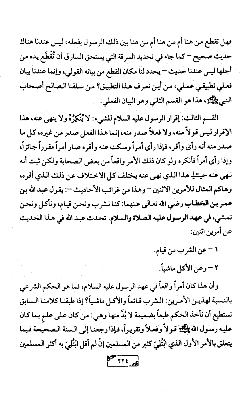 القسم الثالث: إقرار الرسول عليه السلام للشيء: لا يُنْكِرُهُ ولا ينهى عنه، هذا الإقرار ليس قولاً منه، ولا فعلاً صدر منه، إنما هذا الفعل صدر من غيره، كل ما صدر منه أنه رأى وأقر، فإذا رأى أمراً وسكت عنه وأقره صار أمراً مقرراً جائزاً، وإذا رأى أمراً فأنكره ولو كان ذلك الأمر واقعاً من بعض الصحابة ولكن ثبت أنه نهى عنه حينئذٍ هذا الذي نهى عنه يختلف كل الاختلاف عن ذلك الذي أقره، وهاكم المثال للأمرين الاثنين - وهذا من غرائب الأحاديث -: يقول عبد الله بن عمر بن الخطاب رضي الله تعالى عنهما: كنا نشرب ونحن قيام، ونأكل ونحن نمشي، في عهد الرسول عليه الصلاة والسلام. تحدث عبد الله في هذا الحديث عن أمرين اثنين: