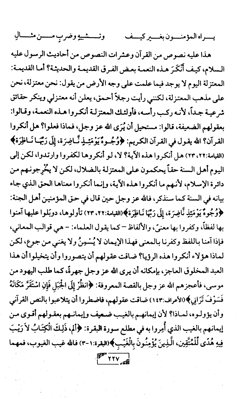 يراه المؤمنون بغير كيف ... وتشبيهٍ وضربٍ من مثالِ
