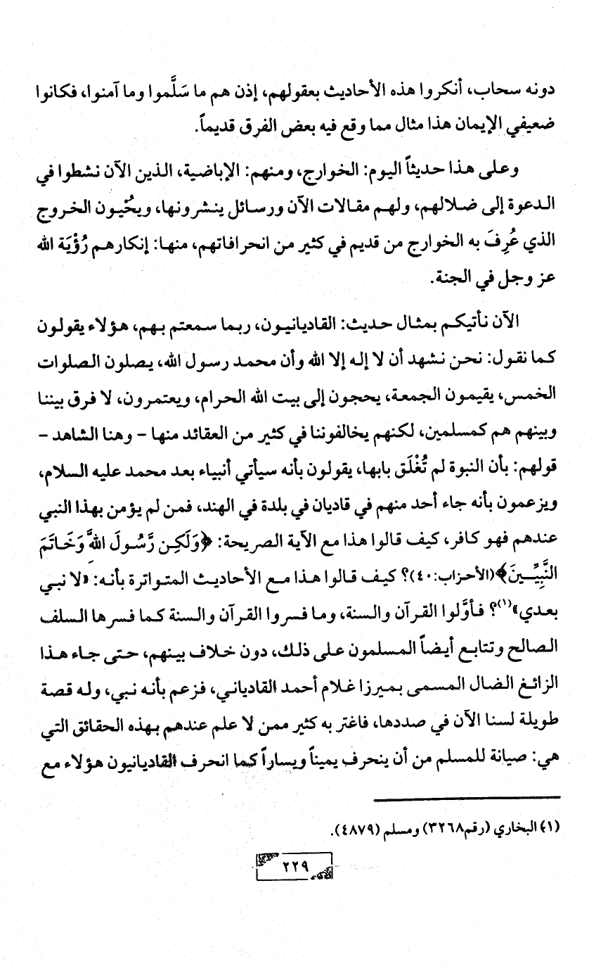 الآن نأتيكم بمثال حديث: القاديانيون، ربما سمعتم بهم، هؤلاء يقولون كما نقول: نحن نشهد أن لا إله إلا الله وأن محمد رسول الله، يصلون الصلوات الخمس، يقيمون الجمعة، يحجون إلى بيت الله الحرام، ويعتمرون، لا فرق بيننا وبينهم هم كمسلمين، لكنهم يخالفوننا في كثير من العقائد منها - وهنا الشاهد - قولهم: بأن النبوة لم تُغْلَق بابها، يقولون بأنه سيأتي أنبياء بعد محمد عليه السلام، ويزعمون بأنه جاء أحد منهم في قاديان في بلدة في الهند، فمن لم يؤمن بهذا النبي عندهم فهو كافر، كيف قالوا هذا مع الآية الصريحة: {وَلَكِن رَّسُولَ اللَّهِ وَخَاتَمَ النَّبِيِّينَ} (الأحزاب:40)؟ كيف قالوا هذا مع الأحاديث المتواترة بأنه: «لا نبي بعدي» (¬1)؟ فأوَّلوا القرآن والسنة، وما فسروا القرآن والسنة كما فسرها السلف الصالح وتتابع أيضاً المسلمون على ذلك، دون خلاف بينهم، حتى جاء هذا الزائغ الضال المسمى بميرزا غلام أحمد القادياني، فزعم بأنه نبي، وله قصة طويلة لسنا الآن في صددها، فاغتر به كثير ممن لا علم عندهم بهذه الحقائق التي هي: صيانة للمسلم من أن ينحرف يميناً ويساراً كما انحرف القاديانيون هؤلاء مع