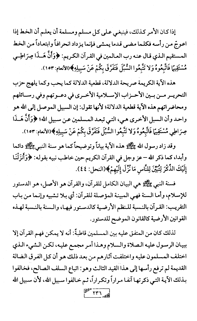 هذه الآية الكريمة صريحة الدلالة، قطعية الدلالة كما يحب وكما يلهج حزب التحرير من بين الأحزاب الإسلامية الأخرى في دعوتهم وفي رسائلهم ومحاضراتهم هذه الآية قطعية الدلالة؛ لأنها تقول: إن السبيل الموصل إلى الله هو واحد وأن السبل الأخرى هي، التي تبعد المسلمين عن سبيل الله؛ {وَأَنَّ هَذَا صِرَاطِي مُسْتَقِيمًا فَاتَّبِعُوهُ وَلا تَتَّبِعُوا السُّبُلَ فَتَفَرَّقَ بِكُمْ عَنْ سَبِيلِهِ} (الأنعام: 153).