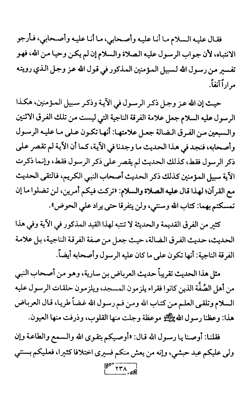 فقال عليه السلام ما أنا عليه وأصحابي، ما أنا عليه وأصحابي، فأرجو الانتباه، لأن جواب الرسول عليه الصلاة والسلام إن لم يكن وحيا من الله، فهو تفسير من رسول الله لسبيل المؤمنين المذكور في قول الله عز وجل الذي رويته مراراً آنفاً.