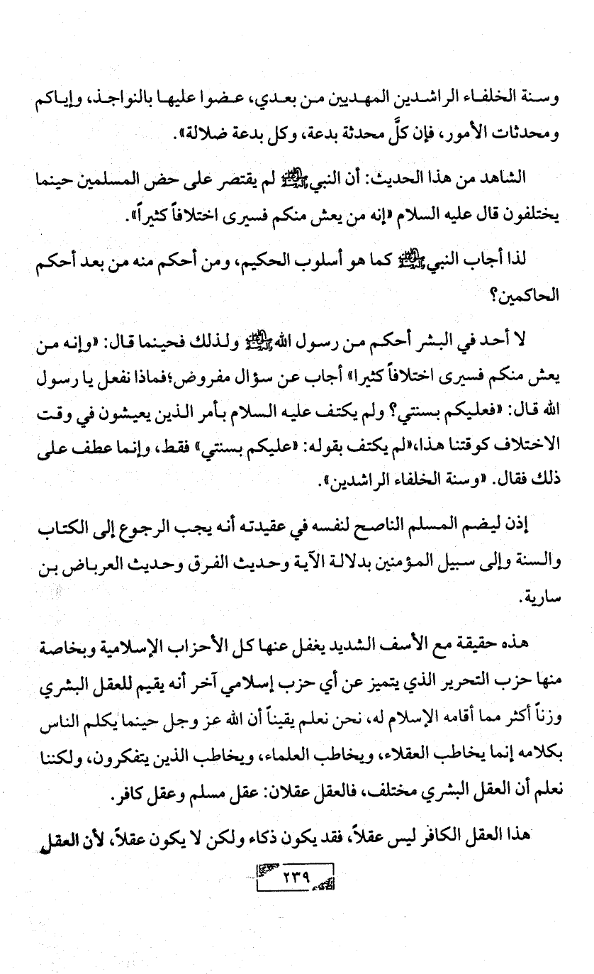 هذه حقيقة مع الأسف الشديد يغفل عنها كل الأحزاب الإسلامية وبخاصة منها حزب التحرير الذي يتميز عن أي حزب إسلامي آخر أنه يقيم للعقل البشري وزناً أكثر مما أقامه الإسلام له، نحن نعلم يقيناً أن الله عز وجل حينما يكلم الناس بكلامه إنما يخاطب العقلاء، ويخاطب العلماء، ويخاطب الذين يتفكرون، ولكننا نعلم أن العقل البشري مختلف، فالعقل عقلان: عقل مسلم وعقل كافر.