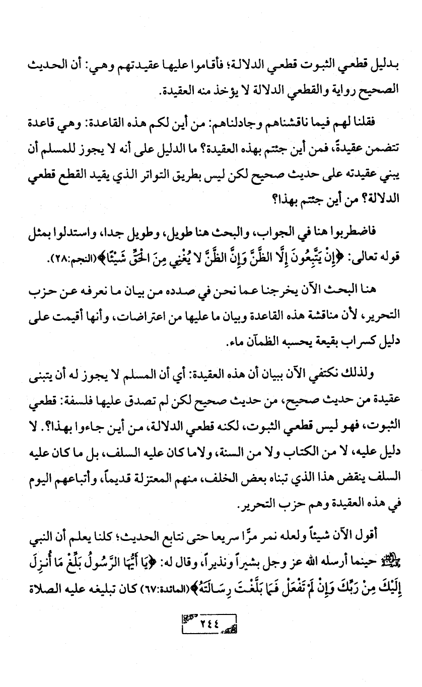 ولذلك نكتفي الآن ببيان أن هذه العقيدة: أي أن المسلم لا يجوز له أن يتبنى عقيدة من حديث صحيح، من حديث صحيح لكن لم تصدق عليها فلسفة: قطعي الثبوت، فهو ليس قطعي الثبوت، لكنه قطعي الدلالة، من أين جاءوا بهذا؟. لا دليل عليه، لا من الكتاب ولا من السنة، ولاما كان عليه السلف، بل ما كان عليه السلف ينقض هذا الذي تبناه بعض الخلف، منهم المعتزلة قديماً، وأتباعهم اليوم في هذه العقيدة وهم حزب التحرير.