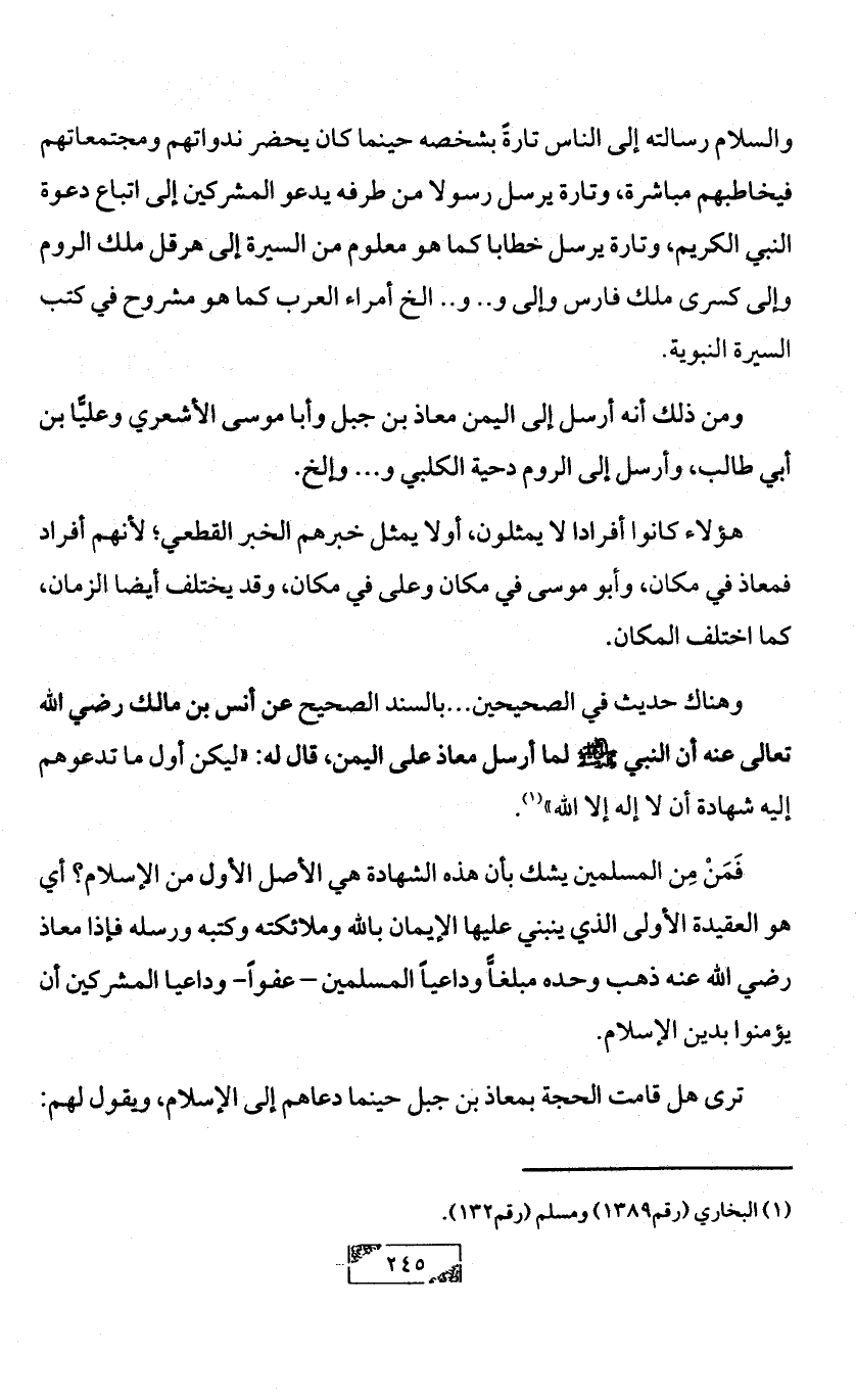 فَمَنْ مِن المسلمين يشك بأن هذه الشهادة هي الأصل الأول من الإسلام؟ أي هو العقيدة الأولى الذي ينبني عليها الإيمان بالله وملائكته وكتبه ورسله فإذا معاذ رضي الله عنه ذهب وحده مبلغاًّ وداعياً المسلمين - عفواً- وداعيا المشركين أن يؤمنوا بدين الإسلام.