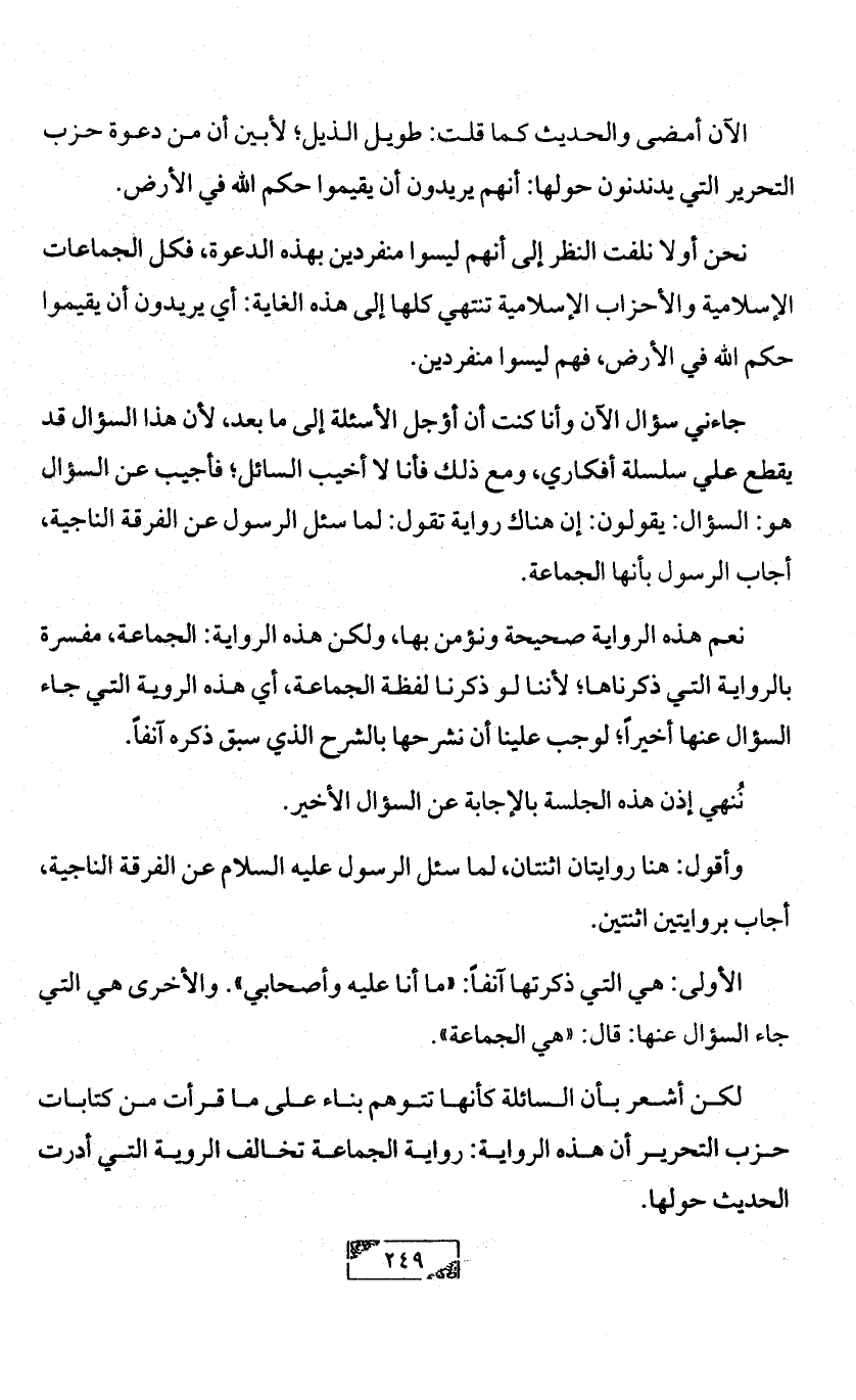 جاءني سؤال الآن وأنا كنت أن أؤجل الأسئلة إلى ما بعد، لأن هذا السؤال قد يقطع علي سلسلة أفكاري، ومع ذلك فأنا لا أخيب السائل؛ فأجيب عن السؤال هو: السؤال: يقولون: إن هناك رواية تقول: لما سئل الرسول عن الفرقة الناجية، أجاب الرسول بأنها الجماعة.