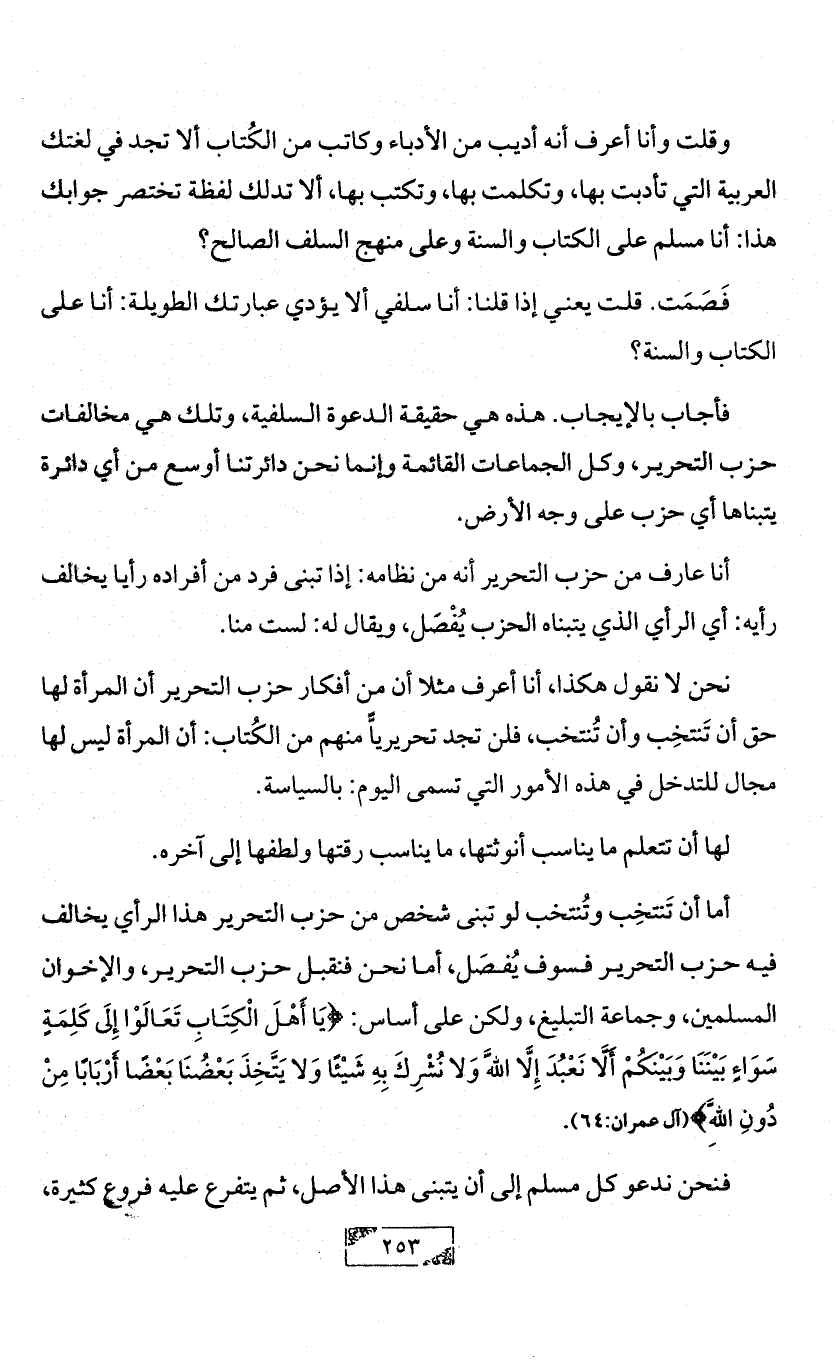 أما أن تَنتخِب وتُنتخب لو تبنى شخص من حزب التحرير هذا الرأي يخالف فيه حزب التحرير فسوف يُفصَل، أما نحن فنقبل حزب التحرير، والإخوان المسلمين، وجماعة التبليغ، ولكن على أساس: {يَا أَهْلَ الْكِتَابِ تَعَالَوْا إِلَى كَلِمَةٍ سَوَاءٍ بَيْنَنَا وَبَيْنَكُمْ أَلَّا نَعْبُدَ إِلَّا اللَّهَ وَلا نُشْرِكَ بِهِ شَيْئًا وَلا يَتَّخِذَ بَعْضُنَا بَعْضًا أَرْبَابًا مِنْ دُونِ اللَّهِ} (آل عمران:64).