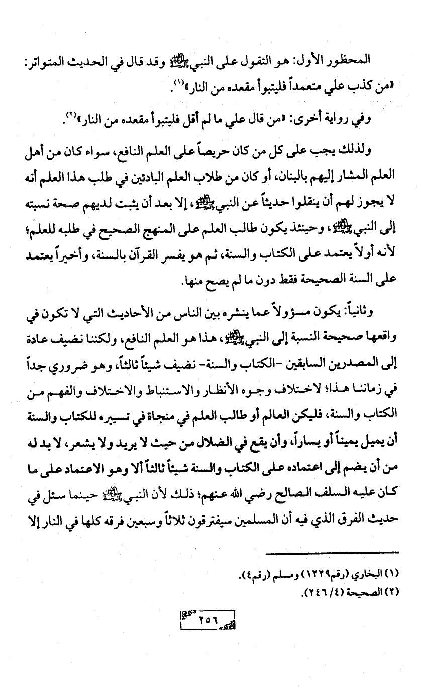 وثانياً: يكون مسؤولاً عما ينشره بين الناس من الأحاديث التي لا تكون في واقعها صحيحة النسبة إلى النبي - صلى الله عليه وآله وسلم -، هذا هو العلم النافع، ولكننا نضيف عادة إلى المصدرين السابقين -الكتاب والسنة- نضيف شيئاً ثالثاً، وهو ضروري جداً في زماننا هذا؛ لاختلاف وجوه الأنظار والاستنباط والاختلاف والفهم من الكتاب والسنة، فليكن العالم أو طالب العلم في منجاة في تسييره للكتاب والسنة أن يميل يميناً أو يساراً، وأن يقع في الضلال من حيث لا يريد ولا يشعر، لا بد له من أن يضم إلى اعتماده على الكتاب والسنة شيئاً ثالثاً ألا وهو الاعتماد على ما كان عليه السلف الصالح رضي الله عنهم؛ ذلك لأن النبي - صلى الله عليه وآله وسلم - حينما سئل في حديث الفرق الذي فيه أن المسلمين سيفترقون ثلاثاً وسبعين فرقه كلها في النار إلا