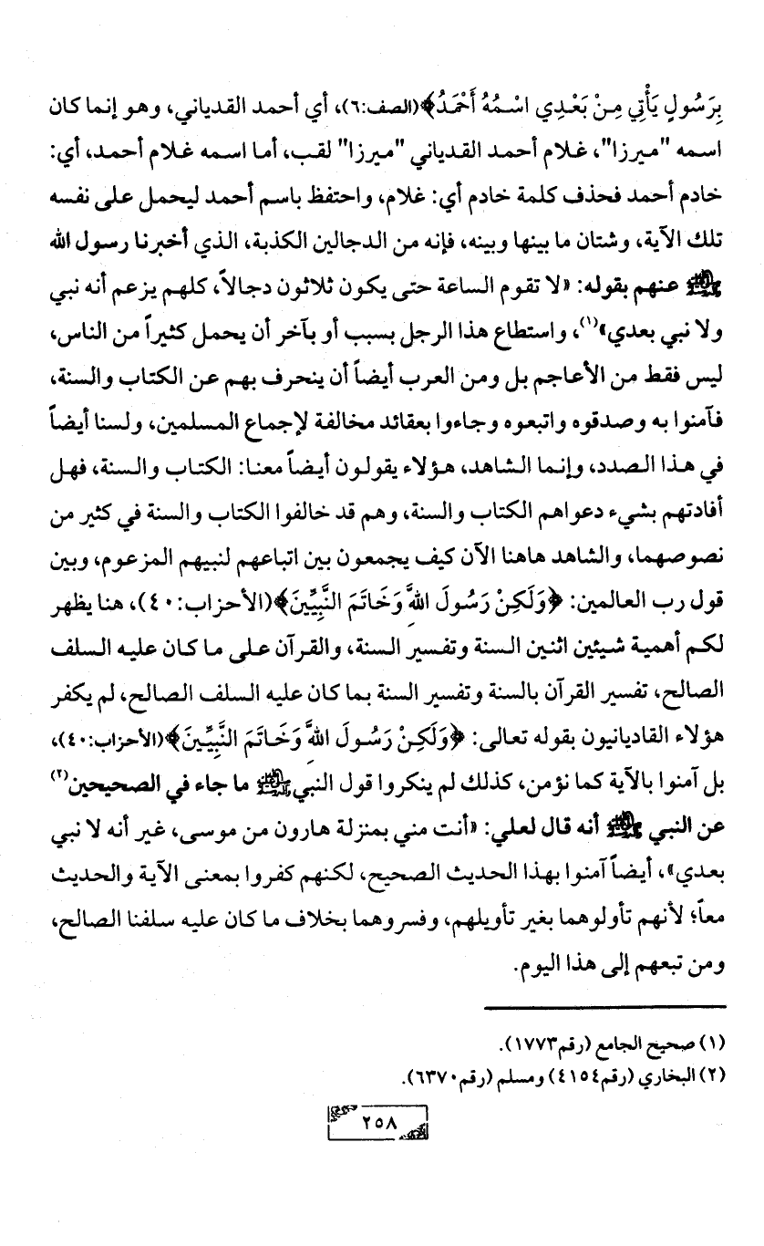 بِرَسُولٍ يَأْتِي مِنْ بَعْدِي اسْمُهُ أَحْمَدُ} (الصف:6)، أي أحمد القدياني، وهو إنما كان اسمه "ميرزا"، غلام أحمد القدياني "ميرزا" لقب، أما اسمه غلام أحمد، أي: خادم أحمد فحذف كلمة خادم أي: غلام، واحتفظ باسم أحمد ليحمل على نفسه تلك الآية، وشتان ما بينها وبينه، فإنه من الدجالين الكذبة، الذي أخبرنا رسول الله - صلى الله عليه وآله وسلم - عنهم بقوله: «لا تقوم الساعة حتى يكون ثلاثون دجالاً، كلهم يزعم أنه نبي ولا نبي بعدي» (¬1)، واستطاع هذا الرجل بسبب أو بآخر أن يحمل كثيراً من الناس، ليس فقط من الأعاجم بل ومن العرب أيضاً أن ينحرف بهم عن الكتاب والسنة، فآمنوا به وصدقوه واتبعوه وجاءوا بعقائد مخالفة لإجماع المسلمين، ولسنا أيضاً في هذا الصدد، وإنما الشاهد، هؤلاء يقولون أيضاً معنا: الكتاب والسنة، فهل أفادتهم بشيء دعواهم الكتاب والسنة، وهم قد خالفوا الكتاب والسنة في كثير من نصوصهما، والشاهد هاهنا الآن كيف يجمعون بين اتباعهم لنبيهم المزعوم، وبين قول رب العالمين: {وَلَكِنْ رَسُولَ اللَّهِ وَخَاتَمَ النَّبِيِّينَ} (الأحزاب:40)، هنا يظهر لكم أهمية شيئين اثنين السنة وتفسير السنة، والقرآن على ما كان عليه السلف الصالح، تفسير القرآن بالسنة وتفسير السنة بما كان عليه السلف الصالح، لم يكفر هؤلاء القاديانيون بقوله تعالى: {وَلَكِنْ رَسُولَ اللَّهِ وَخَاتَمَ النَّبِيِّينَ} (الأحزاب:40)، بل آمنوا بالآية كما نؤمن، كذلك لم ينكروا قول النبي - صلى الله عليه وآله وسلم - ما جاء في الصحيحين (¬2) عن النبي - صلى الله عليه وآله وسلم - أنه قال لعلي: «أنت مني بمنزلة هارون من موسى، غير أنه لا نبي بعدي»، أيضاً آمنوا بهذا الحديث الصحيح، لكنهم كفروا بمعنى الآية والحديث معاً؛ لأنهم تأولوهما بغير تأويلهم، وفسروهما بخلاف ما كان عليه سلفنا الصالح، ومن تبعهم إلى هذا اليوم.