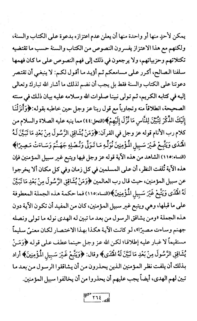 يمكن لأحدٍ منها أو واحدة منها أن يعلن عدم اعتزازه بدعوة على الكتاب والسنة، ولكنهم مع هذا الاعتزاز يفسرون النصوص من الكتاب والسنة حسب ما تقتضيه تكتلاتهم وحزبياتهم، ولا يرجعون في ذلك إلى فهم النصوص على ما كان فهمها سلفنا الصالح، أكرر على مسامعكم ثم أؤيد ما أقول لكم: لا ينبغي أن تقتصر دعوتنا على الكتاب والسنة فقط بل يجب أن نضم لذلك ما أشار الله تبارك وتعالى إليه في كتابه الكريم، ثم تولى نبينا صلوات الله وسلامه عليه بيان ذلك في سنته الصحيحة، انطلاقاً منه وتجاوباً مع قول ربنا عز وجل حين خاطبه بقوله: {وَأَنزَلْنَا إِلَيْكَ الذِّكْرَ لِتُبَيِّنَ لِلنَّاسِ مَا نُزِّلَ إِلَيْهِمْ} (النحل:44) مما ينبه عليه الصلاة والسلام من كلام رب الأنام قوله عز وجل في القرآن: {وَمَنْ يُشَاقِقِ الرَّسُولَ مِنْ بَعْدِ مَا تَبَيَّنَ لَهُ الْهُدَى وَيَتَّبِعْ غَيْرَ سَبِيلِ الْمُؤْمِنِينَ نُوَلِّهِ مَا تَوَلَّى وَنُصْلِهِ جَهَنَّمَ وَسَاءَتْ مَصِيرًا} (النساء:115) الشاهد من هذه الآية قوله عز وجل فيها ويتبع غير سبيل المؤمنين فإن هذه الآية تُلفت النظر، أن على المسلمين في كل زمان وفي كل مكان ألا يخرجوا عن سبيل المؤمنين، حيث قال رب العالمين {وَمَنْ يُشَاقِقِ الرَّسُولَ مِنْ بَعْدِ مَا تَبَيَّنَ لَهُ الْهُدَى وَيَتَّبِعْ غَيْرَ سَبِيلِ الْمُؤْمِنِينَ} (النساء:115) فما حكمة هذه الجملة المعطوفة على ما قبلها، وهي ويتبع غير سبيل المؤمنين، كان من المفيد أن تكون الآية دون هذه الجملة «ومن يشاقق الرسول من بعد ما تبين له الهدى نوله ما تولى ونصله جهنم وساءت مصيرًا»، لو كانت الآية هكذا بهذا الاختصار لكان معنىً سليماً مستقيماً لا غبار عليه إطلاقا؛ لكن الله عز وجل حينما عطف على قوله {وَمَنْ يُشَاقِقِ الرَّسُولَ مِنْ بَعْدِ مَا تَبَيَّنَ لَهُ الْهُدَى} وقال: {وَيَتَّبِعْ غَيْرَ سَبِيلِ الْمُؤْمِنِينَ} أراد بذلك أن يلفت نظر المؤمنين الذين يحذرون من أن يشاققوا الرسول من بعد ما تبين لهم الهدى، أيضاً يجب عليهم أن يحذروا من أن يخالفوا سبيل المؤمنين.