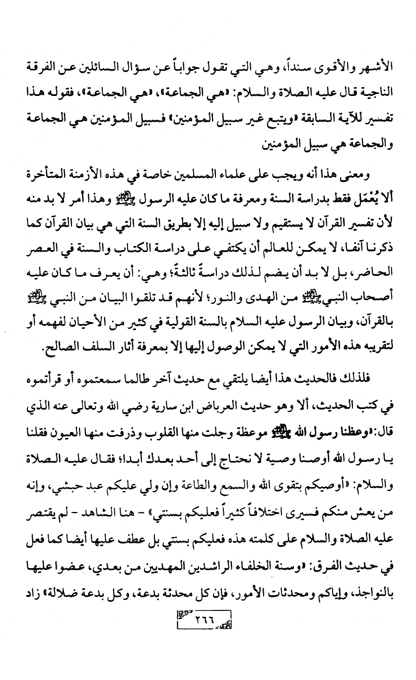 فلذلك فالحديث هذا أيضا يلتقي مع حديث آخر طالما سمعتموه أو قرأتموه في كتب الحديث، ألا وهو حديث العرباض ابن سارية رضي الله وتعالى عنه الذي قال: «وعظنا رسول الله - صلى الله عليه وآله وسلم - موعظة وجلت منها القلوب وذرفت منها العيون فقلنا يا رسول الله أوصنا وصية لا نحتاج إلى أحد بعدك أبدا؛ فقال عليه الصلاة والسلام: «أوصيكم بتقوى الله والسمع والطاعة وإن ولي عليكم عبد حبشي، وإنه من يعش منكم فسيرى اختلافاً كثيراً فعليكم بسنتي» - هنا الشاهد - لم يقتصر عليه الصلاة والسلام على كلمته هذه فعليكم بسنتي بل عطف عليها أيضا كما فعل في حديث الفرق: «وسنة الخلفاء الراشدين المهديين من بعدي، عضوا عليها بالنواجذ، وإياكم ومحدثات الأمور، فإن كل محدثة بدعة، وكل بدعة ضلالة» زاد