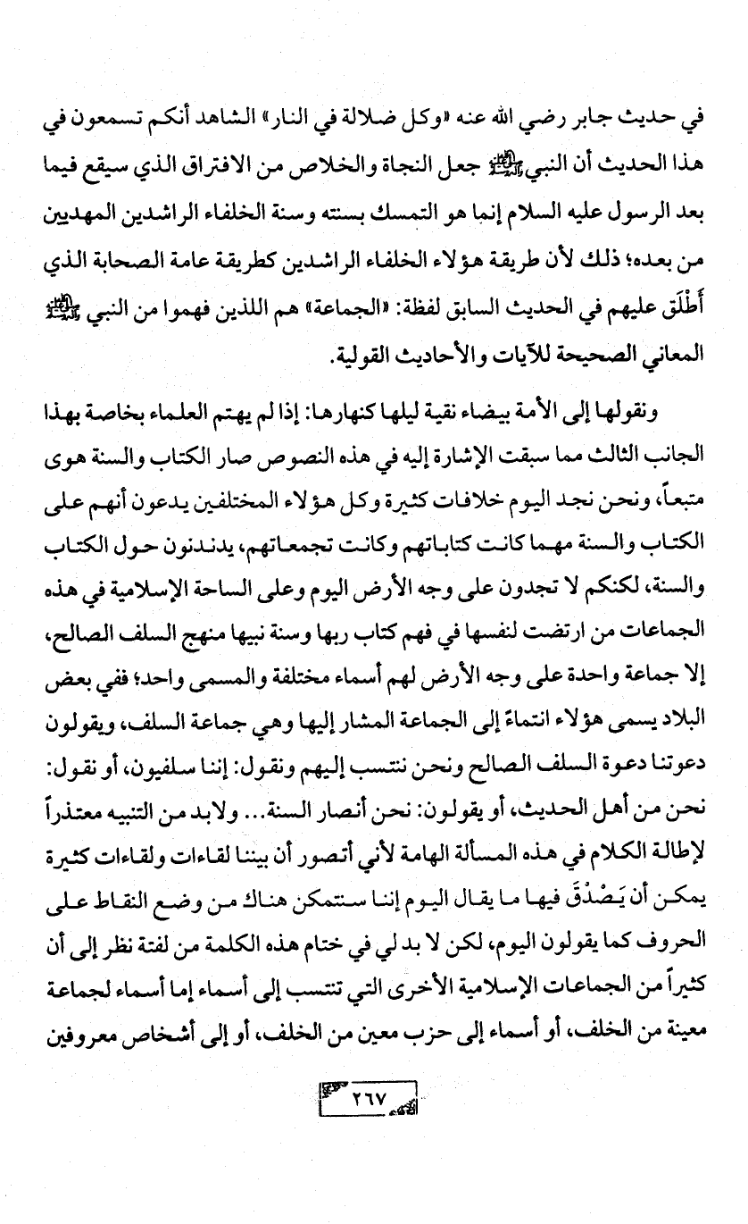 في حديث جابر رضي الله عنه «وكل ضلالة في النار» الشاهد أنكم تسمعون في هذا الحديث أن النبي - صلى الله عليه وآله وسلم - جعل النجاة والخلاص من الافتراق الذي سيقع فيما بعد الرسول عليه السلام إنما هو التمسك بسنته وسنة الخلفاء الراشدين المهديين من بعده؛ ذلك لأن طريقة هؤلاء الخلفاء الراشدين كطريقة عامة الصحابة الذي أَطْلَق عليهم في الحديث السابق لفظة: «الجماعة» هم اللذين فهموا من النبي - صلى الله عليه وآله وسلم - المعاني الصحيحة للآيات والأحاديث القولية.