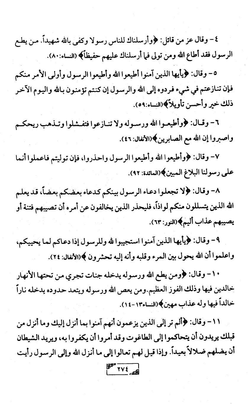 5 - وقال: {يأيها الذين آمنوا أطيعوا الله وأطيعوا الرسول وأولى الأمر منكم فإن تنازعتم في شيء فردوه إلى الله والرسول إن كنتم تؤمنون بالله واليوم الآخر ذلك خير وأحسن تأويلاً} (النساء:59).