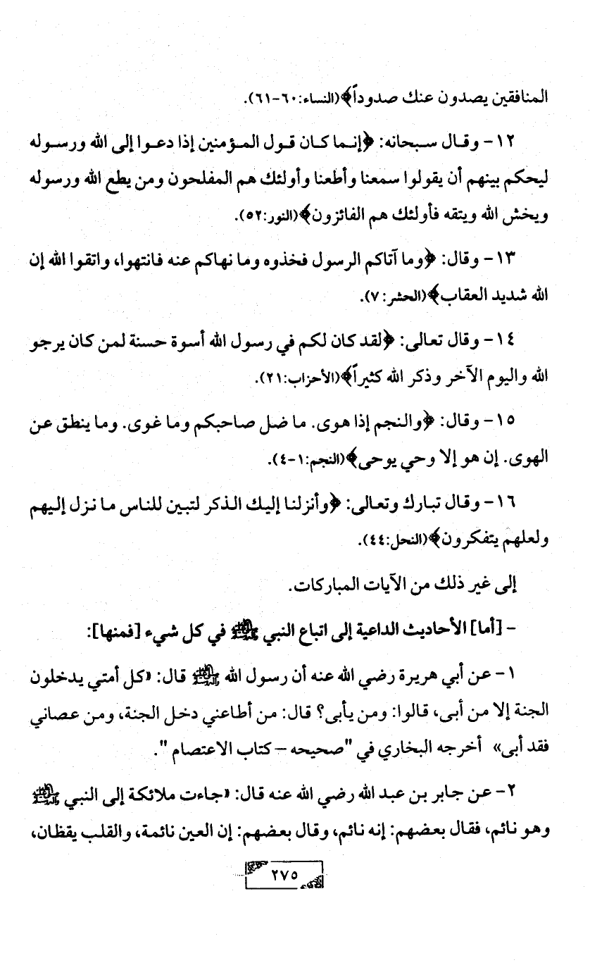 1 - عن أبي هريرة رضي الله عنه أن رسول الله - صلى الله عليه وآله وسلم - قال: «كل أمتي يدخلون الجنة إلا من أبى، قالوا: ومن يأبى؟ قال: من أطاعني دخل الجنة، ومن عصاني فقد أبى «أخرجه البخاري في "صحيحه - كتاب الاعتصام ".