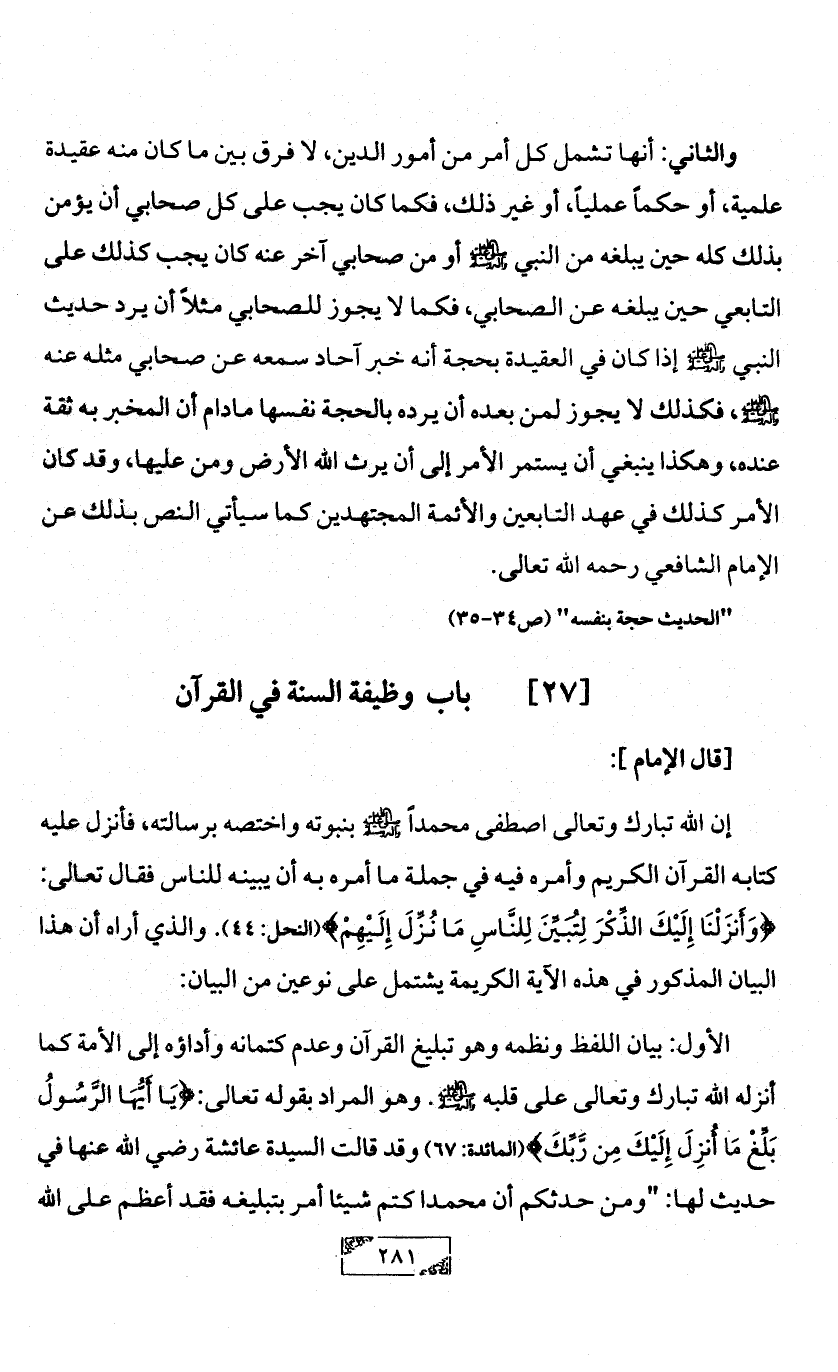 والثاني: أنها تشمل كل أمر من أمور الدين، لا فرق بين ما كان منه عقيدة علمية، أو حكماً عملياً، أو غير ذلك، فكما كان يجب على كل صحابي أن يؤمن بذلك كله حين يبلغه من النبي - صلى الله عليه وآله وسلم - أو من صحابي آخر عنه كان يجب كذلك على التابعي حين يبلغه عن الصحابي، فكما لا يجوز للصحابي مثلاً أن يرد حديث النبي - صلى الله عليه وآله وسلم - إذا كان في العقيدة بحجة أنه خبر آحاد سمعه عن صحابي مثله عنه - صلى الله عليه وآله وسلم -، فكذلك لا يجوز لمن بعده أن يرده بالحجة نفسها مادام أن المخبر به ثقة عنده، وهكذا ينبغي أن يستمر الأمر إلى أن يرث الله الأرض ومن عليها، وقد كان الأمر كذلك في عهد التابعين والأئمة المجتهدين كما سيأتي النص بذلك عن الإمام الشافعي رحمه الله تعالى.