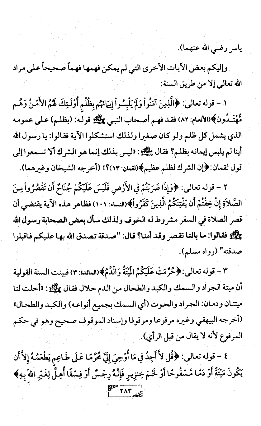 2 - قوله تعالى: {وَإِذَا ضَرَبْتُمْ في الأَرْضِ فَلَيْسَ عَلَيْكُمْ جُنَاحٌ أَن تَقْصُرُواْ مِنَ الصَّلاَةِ إِنْ خِفْتُمْ أَن يَفْتِنَكُمُ الَّذِينَ كَفَرُواْ} (النساء: 101) فظاهر هذه الآية يقتضي أن قصر الصلاة في السفر مشروط له الخوف ولذلك سأل بعض الصحابة رسول الله - صلى الله عليه وآله وسلم - فقالوا: ما بالنا نقصر وقد أمنا؟ قال: "صدقة تصدق الله بها عليكم فاقبلوا صدقته" (رواه مسلم).