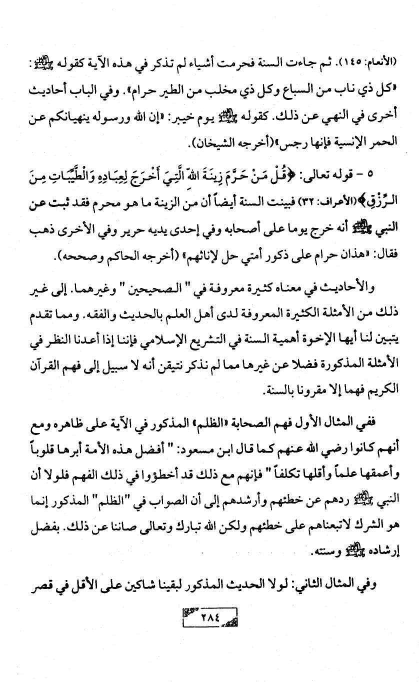 5 - قوله تعالى: {قُلْ مَنْ حَرَّمَ زِينَةَ اللهِ الَّتِيَ أَخْرَجَ لِعِبَادِهِ وَالْطَّيِّبَاتِ مِنَ الرِّزْقِ} (الأعراف: 32) فبينت السنة أيضاً أن من الزينة ما هو محرم فقد ثبت عن النبي - صلى الله عليه وآله وسلم - أنه خرج يوما على أصحابه وفي إحدى يديه حرير وفي الأخرى ذهب فقال: «هذان حرام على ذكور أمتي حل لإناثهم» (أخرجه الحاكم وصححه).